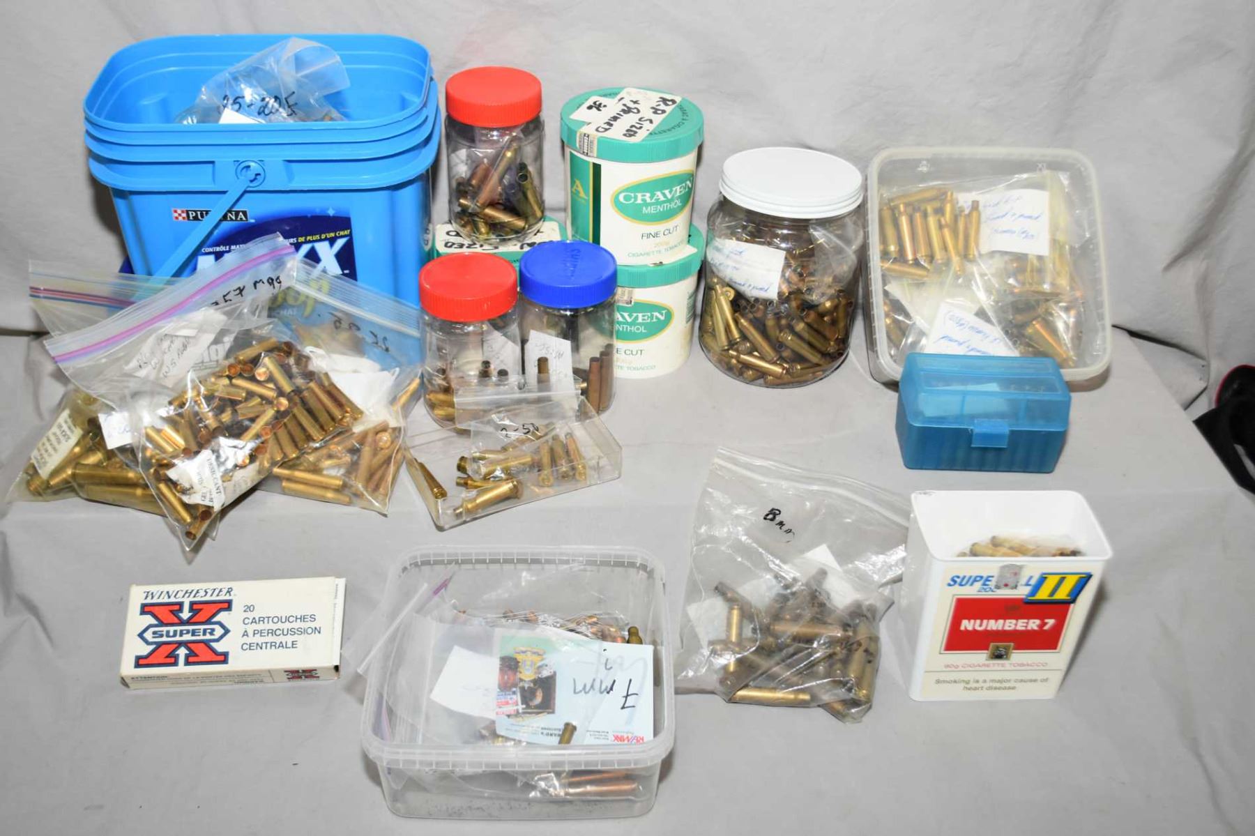 Box Lot : Brass : [ some primed ] : .22 - 250 Cal, .222, .7 MM, .8 MM - Small Blue Plastic Tub : Misc MIxed Brass : .30 - 30, .303 Sav, .38 - 55, .348, .25 - 20 etc.