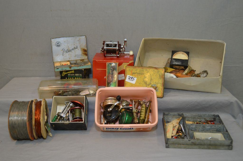 Box Lot : Copper & Wire fishing line, various tackle, reels ( one is Penn ) , fish hooks, etc.