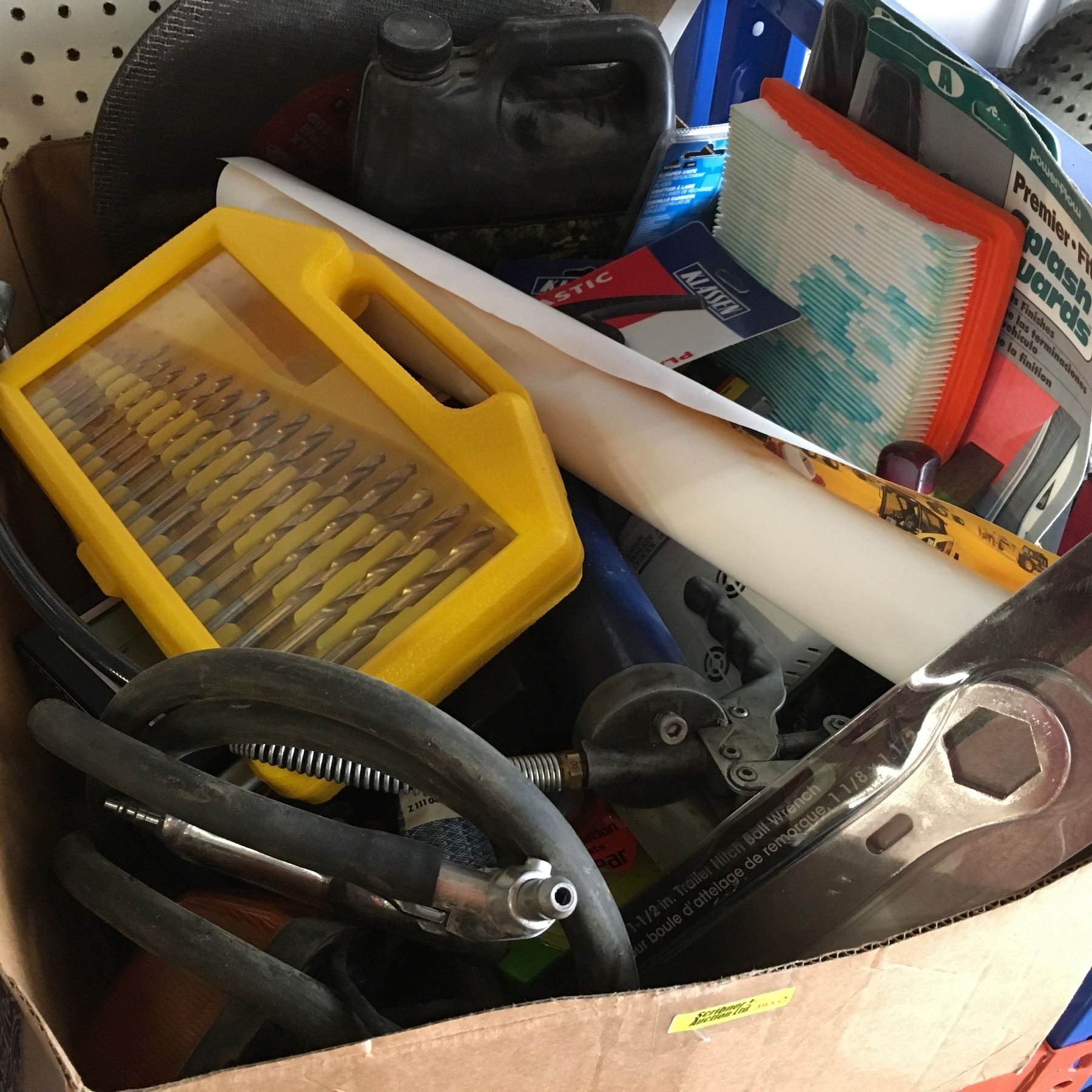 Box Lot: Drill Bits, Grease Gun, Cut Off Wheel, Calking Gun, Parts Washer Gun, Beacon, etc