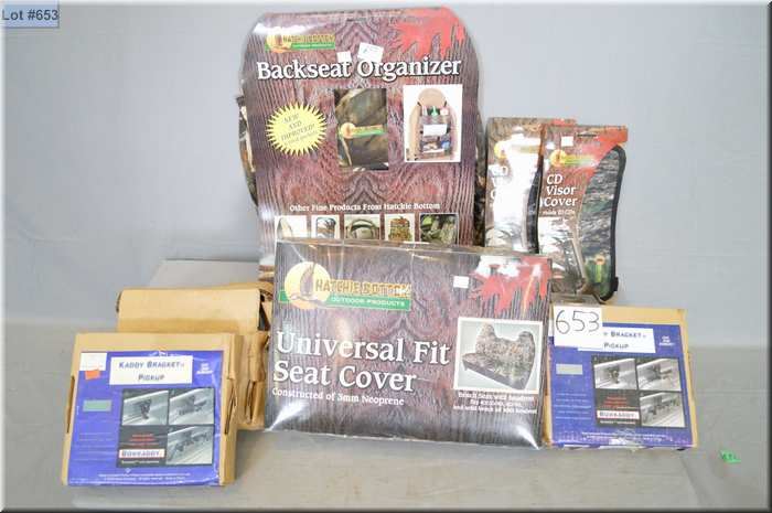 Box Lot : Hatchie Bottom Outdoor Prod. Bench Seat w/ head rest camo seat covers New in pkg Retail $ 178.00 - Hatchie Bottom Outdoor Back Seat Organizer New in pkg Ret. $ 46.00 - ( 2 ) New Hatchie Bottom Camo CD Visor Covers ( holds 20 CD's) Ret. $ 23.00 each - (3) New Kaddy Bracket Pickup Retail $ 34.00