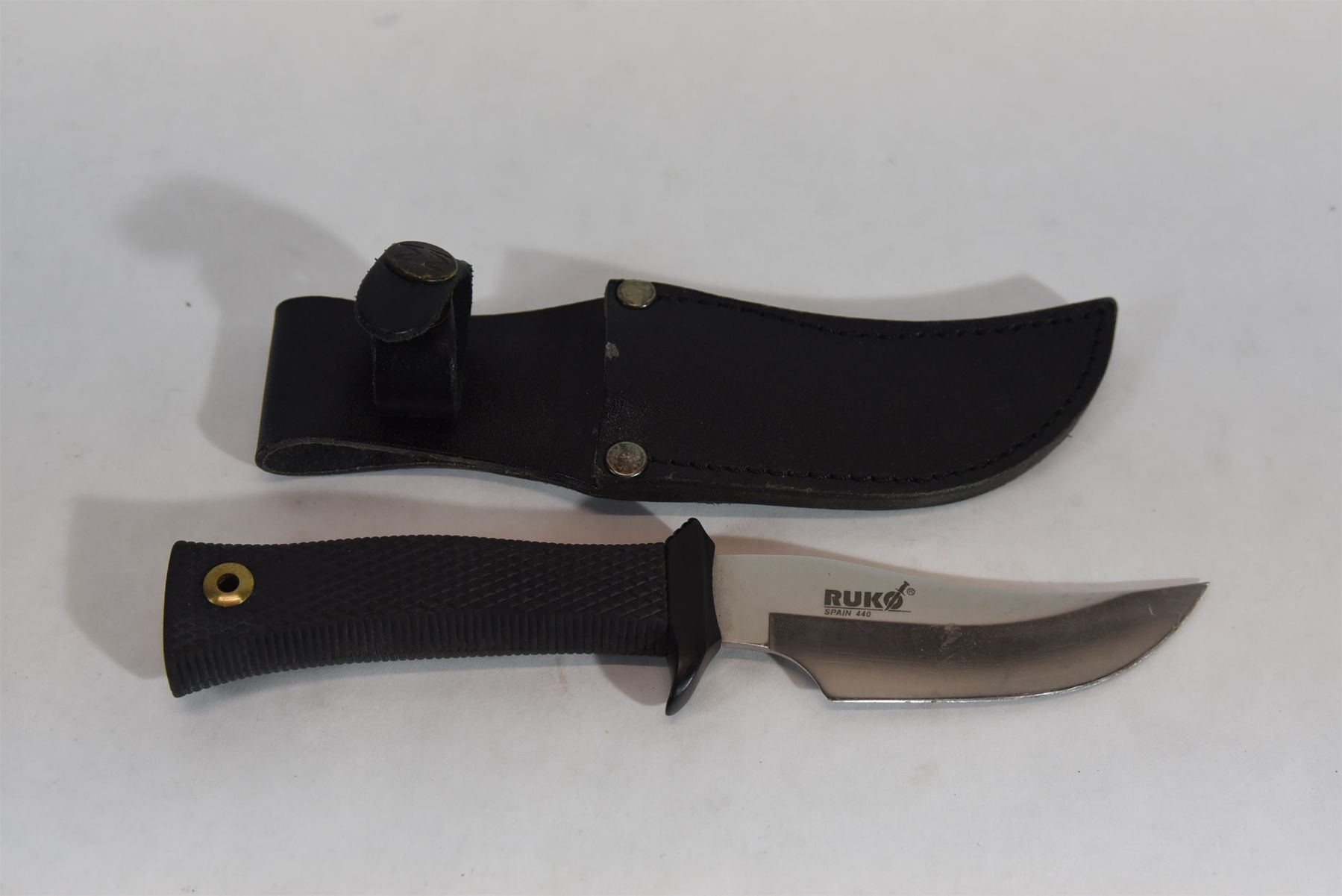 Ruko hunting knife with leather sheath and 440SS 3.75" blade. Made in Spain.