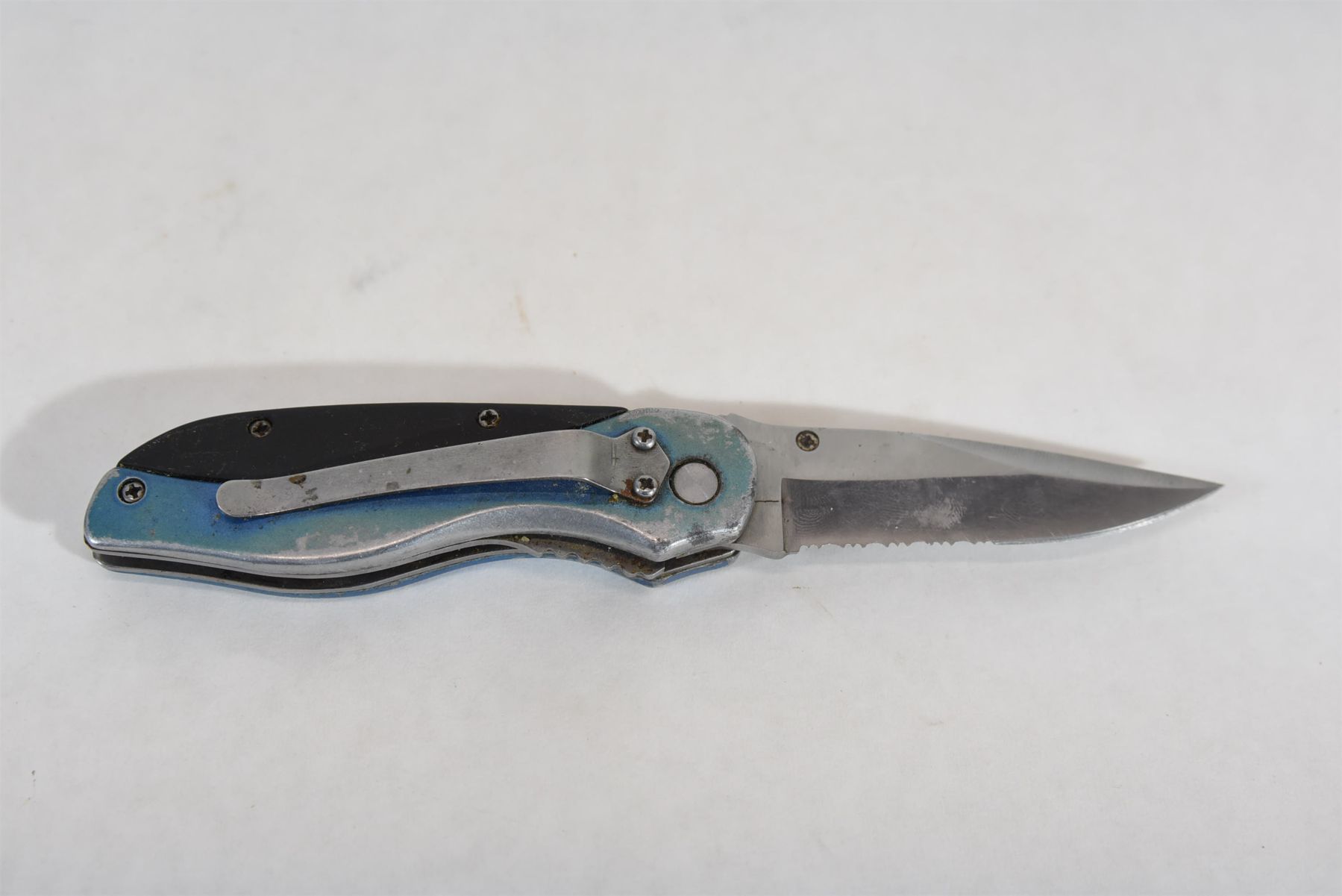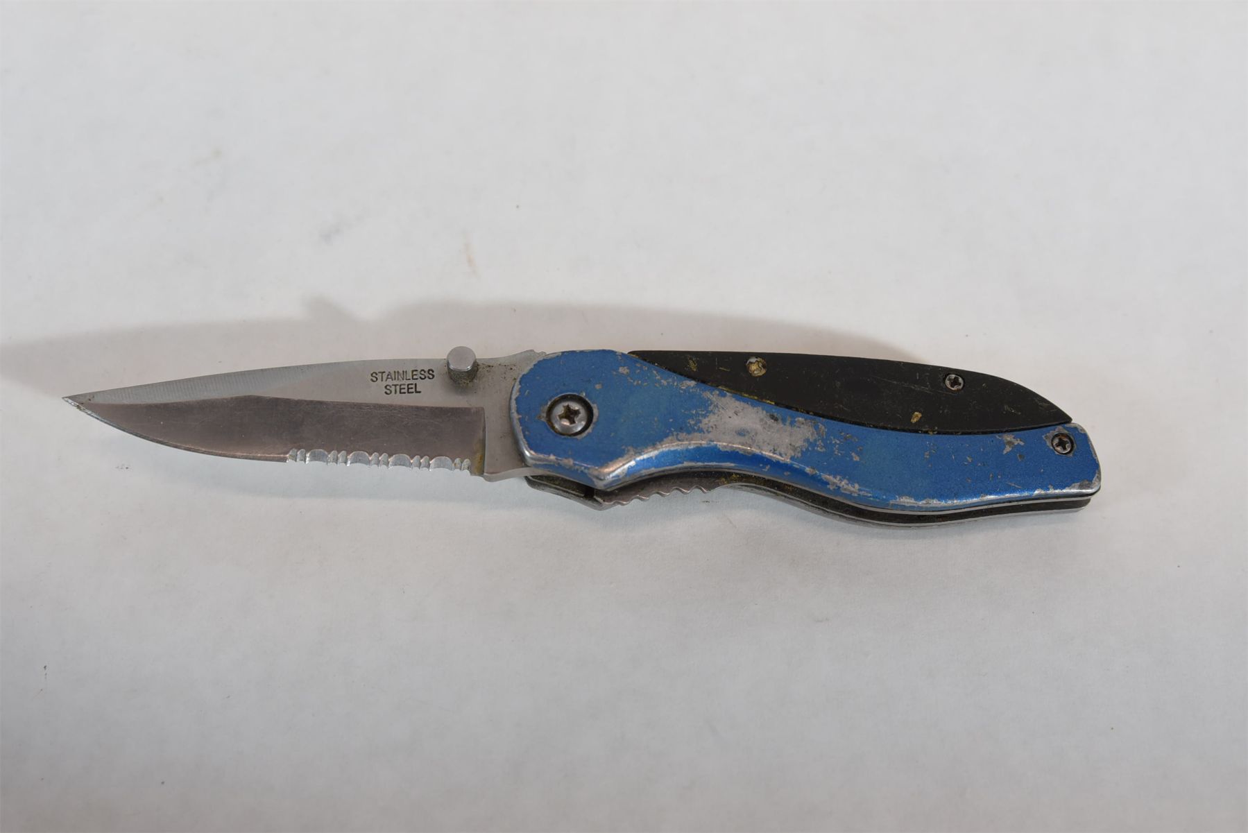 Folding knife with blue/black handle and 3" stainless blade.