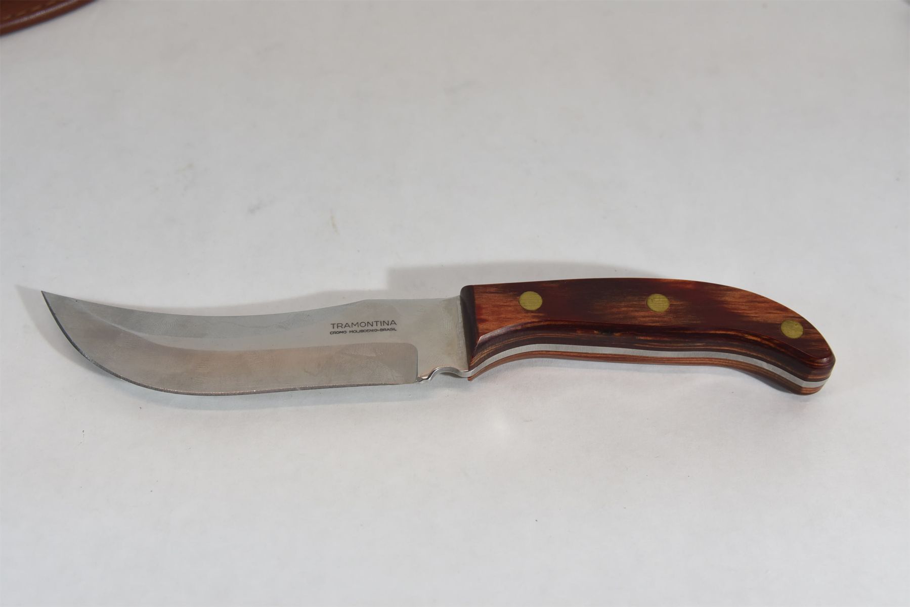 Tramontina hunting knife with leather sheath and 5" blade. Made in Brasil.