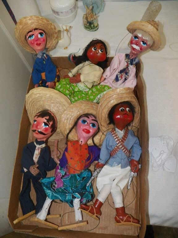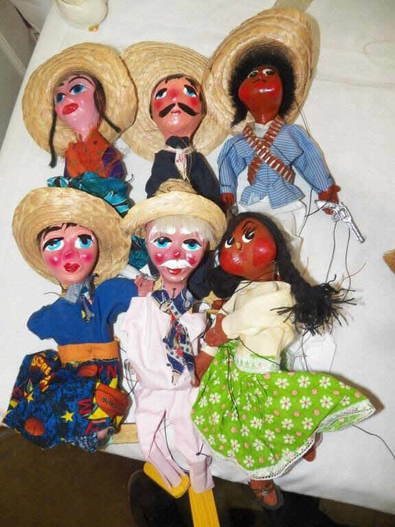 6-Mexican Marionette String Puppet in various conditions. Hand-painted ceramic or clay head, straw hat, molded plastic hands, cotton clothes and legs