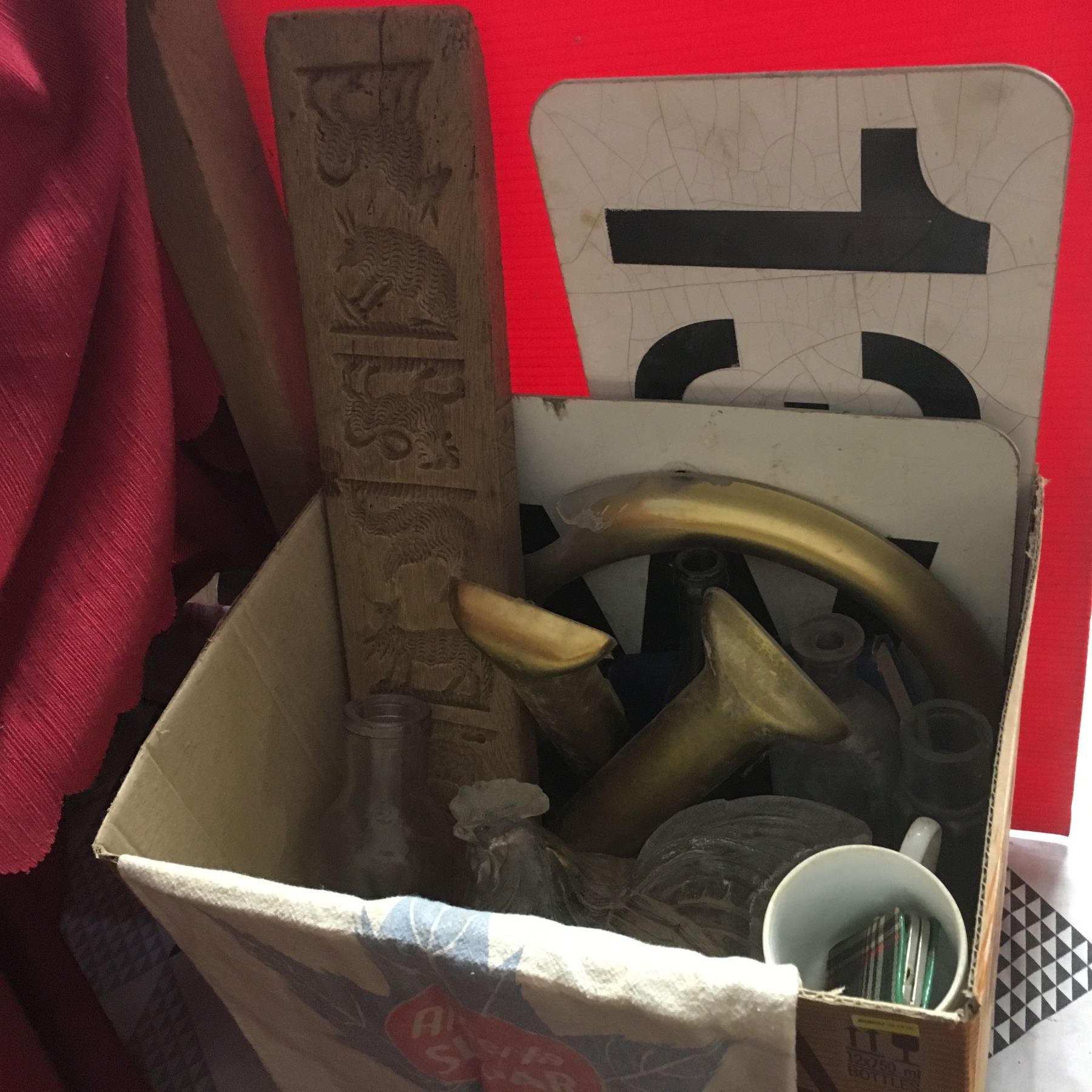 Box Lot: Metal Signs, Letters, Dutch Cookie Mould, Clock, Books, Bottles, etc