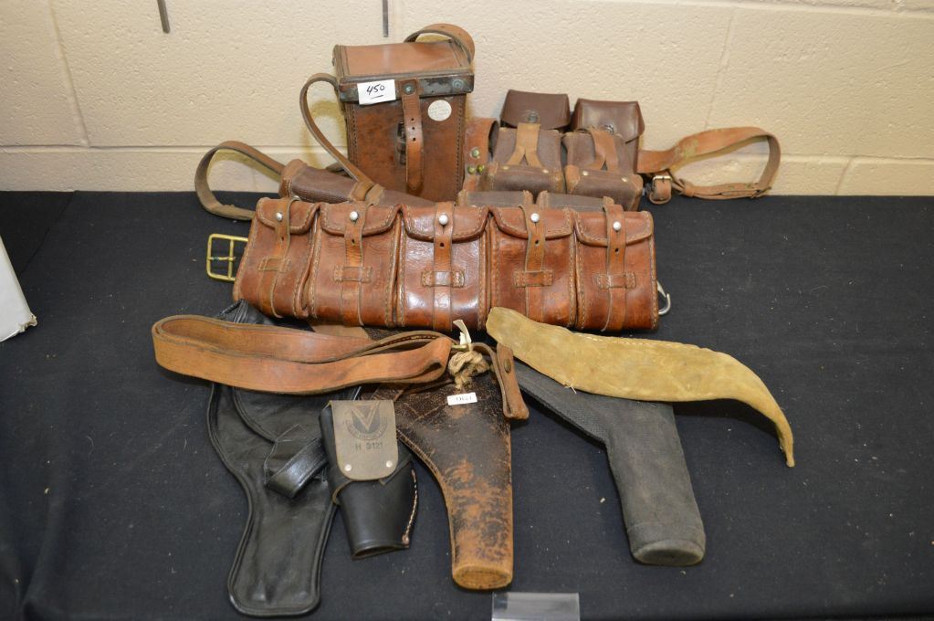 Box Lot : Military Leather Items : .303 Vickers Gun tool & Spare Case Pouch - asstd ammo pouches, belts, small holster - three flap holsters, etc.