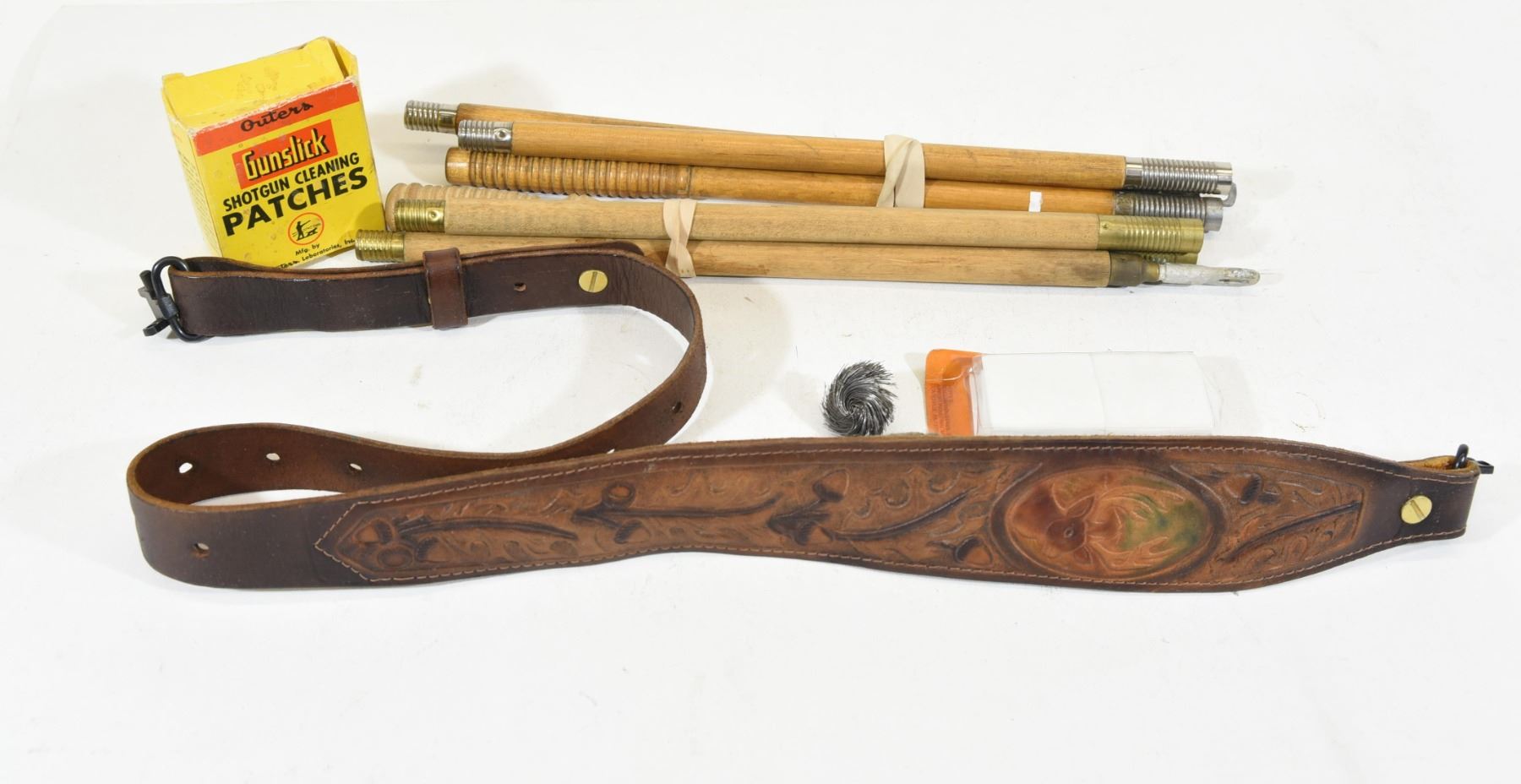 1) 2 antique wooden cleaning rods. 2) Leather tooled rifle sling. 3) Patches, tips and an antique bore brush.