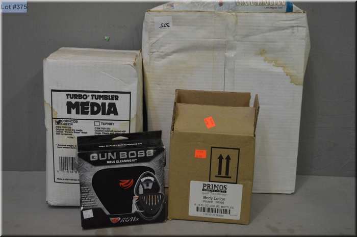 Box Lot : Montana Decoy - White Tail Doe Retail $ 139.,00 , appears as new in box, box damaged - Lyman Turbo Tumbler Media Corn Cob Green appears as new box damaged - Case of 6 Bottles of Primos Unscented face & body lotion, Gun Boss Rifle Cleaning Kit w/orig pkg