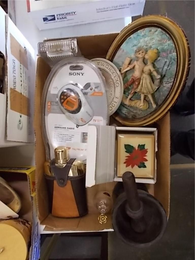 Box Lot, Mortar & Pestle, Flask, Clock, Sony Radio Music Box , made in italy