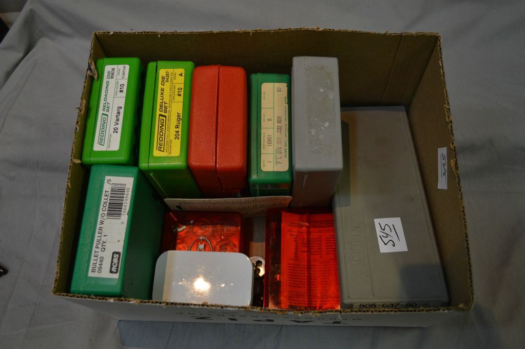 Box Lot : RCBS Bullet Puller w/ collet - Redding Custom 20 Vartarg 2 Die set - Redding .204 Ruger 3 Die set - Red Box : Deluxe Screw Driver Set [ missing some heads ] - RCBS .222 Rem 3 Die Set - Lee Shell Holders - Lee Auto Prime w/die - RCBS Deluxe Seating Die Set - Unknown Tool w/ white metal case - MITUTYO Dial style Caliper in case