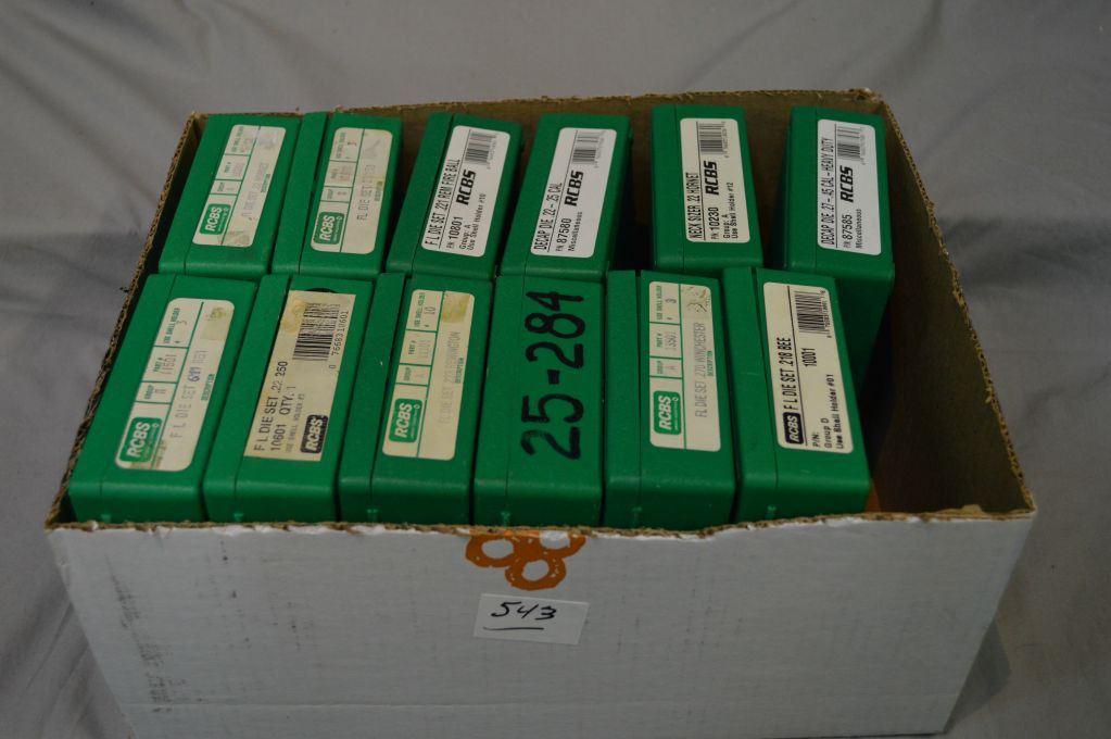 Box Lot : RCBS Reloading Dies : 6 Three Die Sets [ .218 Bee - .270 Win - .25 - 284 - .233 Rem - .22 - 250 - .6 MM Rem - Three 2 Die Sets [ .22 Hornet - .22 - 250 , . 221 Rem Fire Ball - Three One Die Sets [ .22 Hornet Neck Sizer - Decap Die for .22 - 25 cal - Decap Die .27 - .245 Heavy Duty