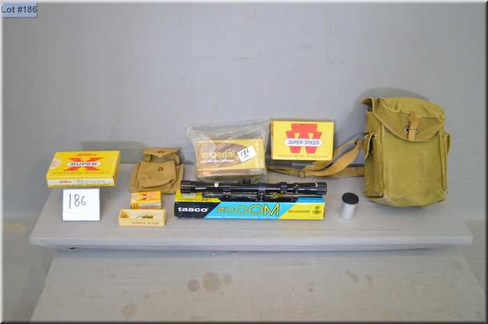 Box Lot : Tasco 3 - 6X Zoom Scope w/orig box - small Military bag & pouch w/few pins - 2 Boxes Imperial .30-30 cal ammo - approx 26 rnds .264 Win Mag ammo - Box plus of .22 ammo -