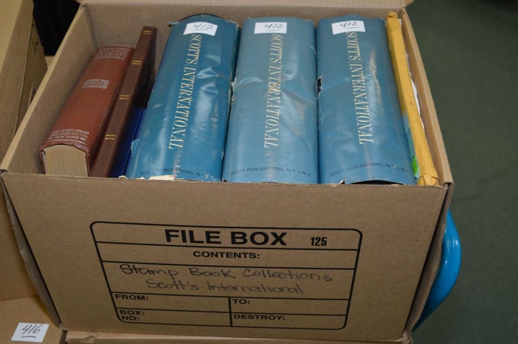 Box Lot : Three Lg Hardcover "Scott's Interational" Stamp Albums w/asstd stamps, Standard Postage & Stamp Catalogue