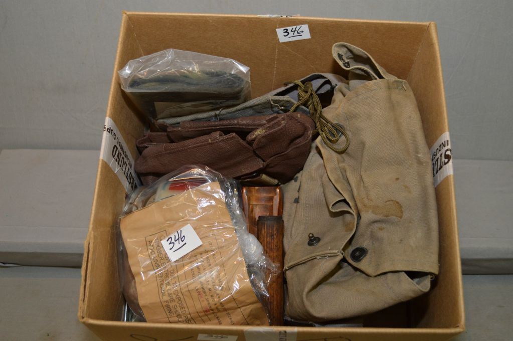 Box Lot : USN Gas Mask Case full of various straps, etc. - Rolling tool case in orig pkg - Mess kit w/solid fuel - spike bayonet web frog - three pouches - bag : three bags of flintlock flints - some percussion musket caps - leather bag full of musket balls - Knight patches - trigger group part for Springfield Armory M1 in orig pkg - shotgun forend, etc.