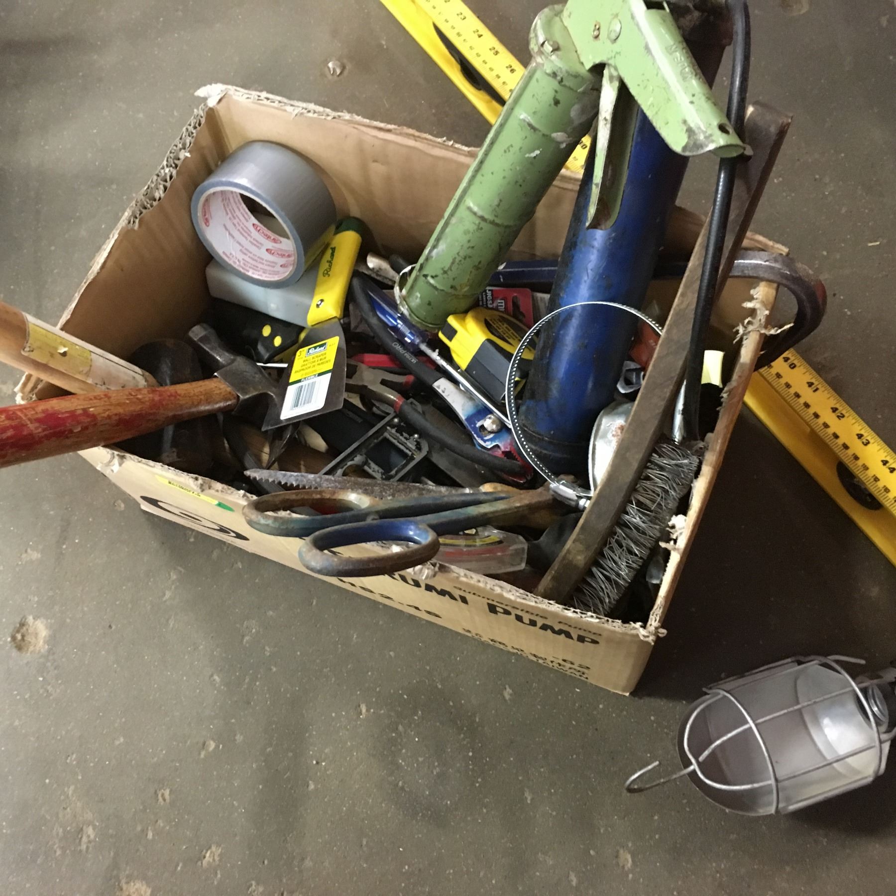 Box Lot: Variety Tools (Hammers, Tape Measure, Trouble Light, Tin Snips, etc) & Level