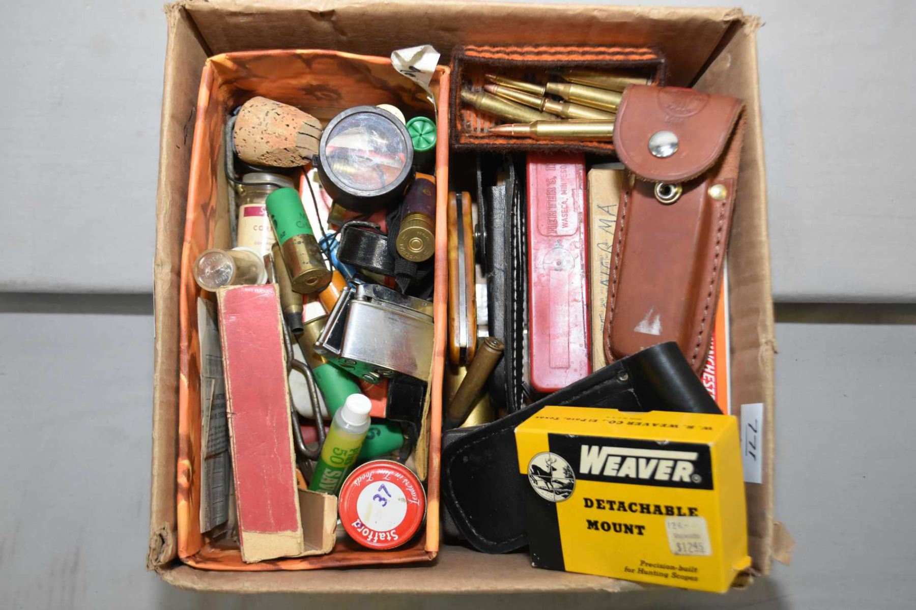 Box Lot : Various Brass, Sight Parts, Shot Shells, Target Front Sights, Two Lighters, Three Pocket K