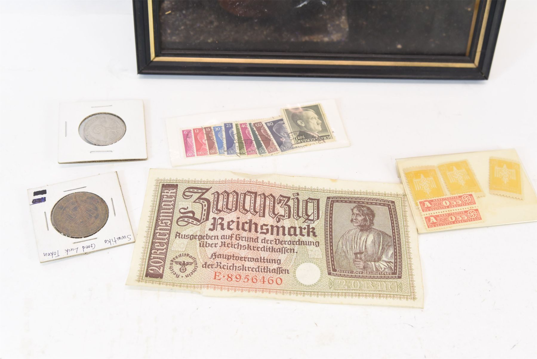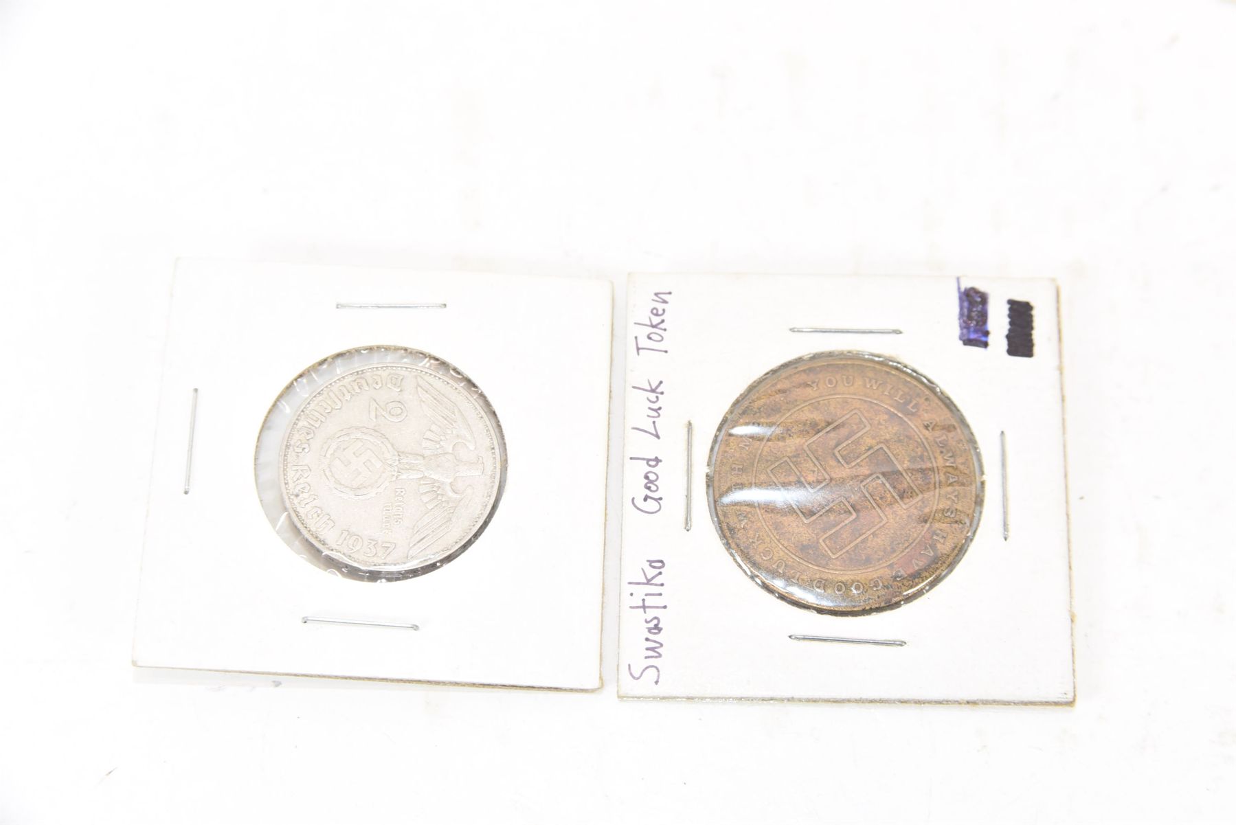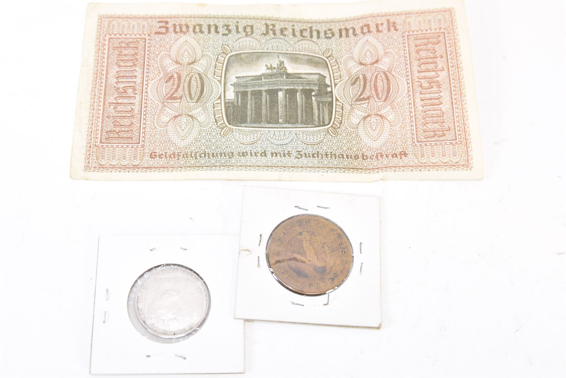 Swastika WWII good luck coin and 20 Reichsmarks paper money,