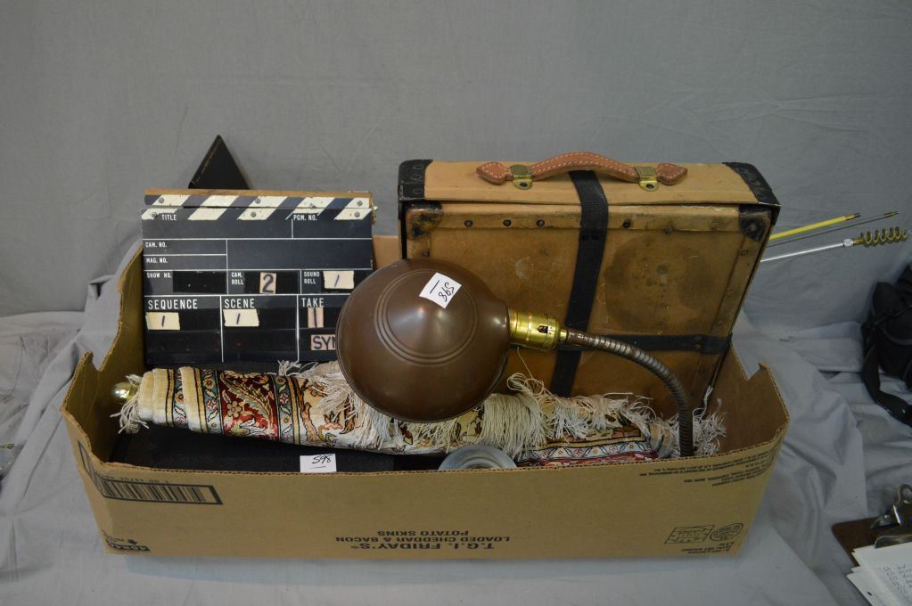 Box Lot : Wool Wall Hanging w/rod "Hunting Scene" - Small Portable Safe Chubs & Sons Ltd. St.James London ( no key ) - Three Cleaning rods - Deco style electric table lamp - Vintage Movie Tin w/case & Action Snap Board - small lantern , etc.
