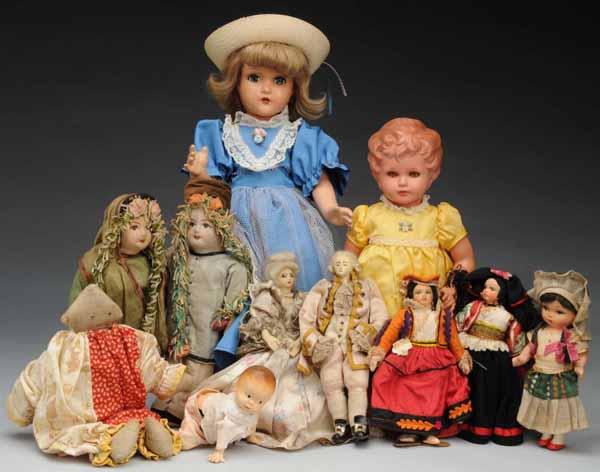 Description Cloth Colonial pair dressed in satin, cloth Indian pair, cloth clown, hard plastic crawling baby, two Lenci-types, small all original composition girl, 20-inch composition girl (redressed), 15-inch Celluloid with turtle mark (eyes need to be glued in). Some fading and soil. Condition (Good). Size Largest: 20" T.