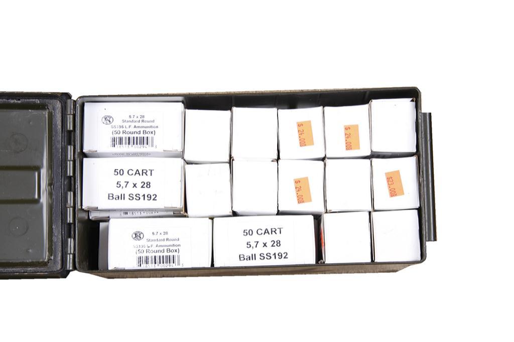 Box Lot of 1900 Rounds 5.7x28 Ammo Consists of 38 boxes of 50 rds each 5.7x28 hollow point ammo made in Belgium by FN.Consists of 38 boxes of 50 rds each 5.7x28 hollow point ammo made in Belgium by FN.