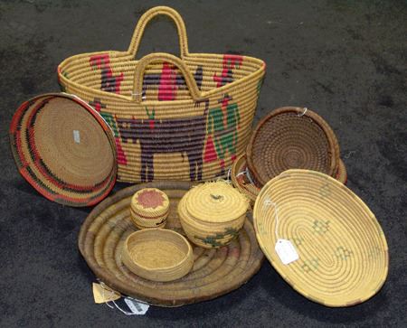 Various Ages, Grouping of different size, age, and types of basketry, two are Indian. Most in good condition, two broken/damaged. Various sizes