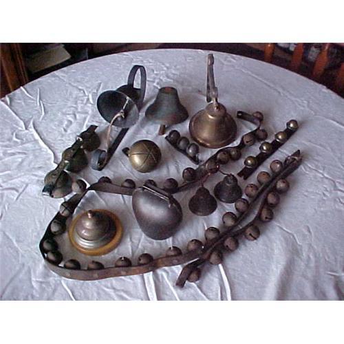 Bells,Box Lot; 35 sleigh bells on original leather strap, steel bells, 1.25" diameter, (2) Wall Mount--1 brass, 5" ; 1 steel--1.25" diameter; 1 Brass Store, 4" Diameter; 1 School diesk tap type on 4" wood base; Pr. 2" diameter brass store door type; Set of 3 mounted shaft bells, brass, 2"--2.25"--2.50 " diameters; Set of 4 Brass sleigh on leather strap;Set of 3" diameter brass sleigh cowbell , steel, 4.5" diameter; Lrg. 3" diameter shaft bell with iron strap for mounting; (c) 1800--early and late -1900's, early- cond. Needs some polishing required; total 12 bells.