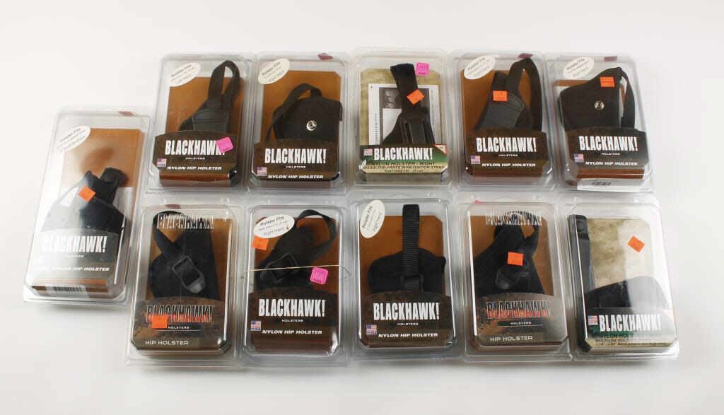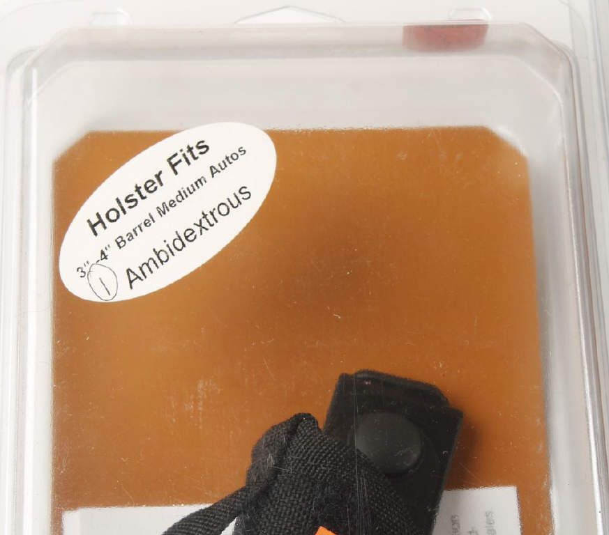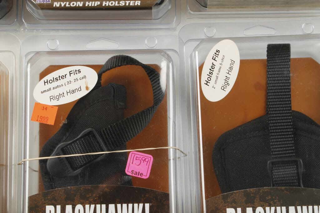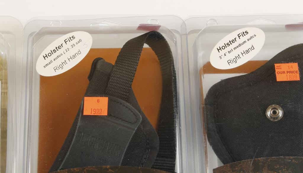 11 holsters in all, fits: small autos, 2'' small frame 5 shots, medium barrel & large autos. Retails for $15.99 each.