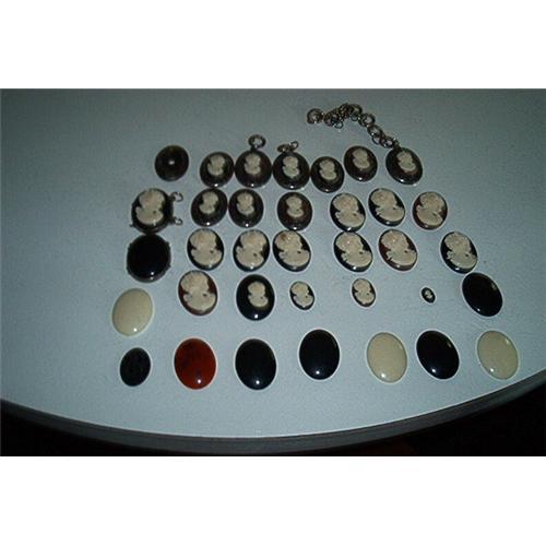 This set consists of 35 loose Cameos. Some with silver tone chains. black backing pieces to add the smaller white cameos to them. Also some brown ones. All in excellent condition with different sizes.