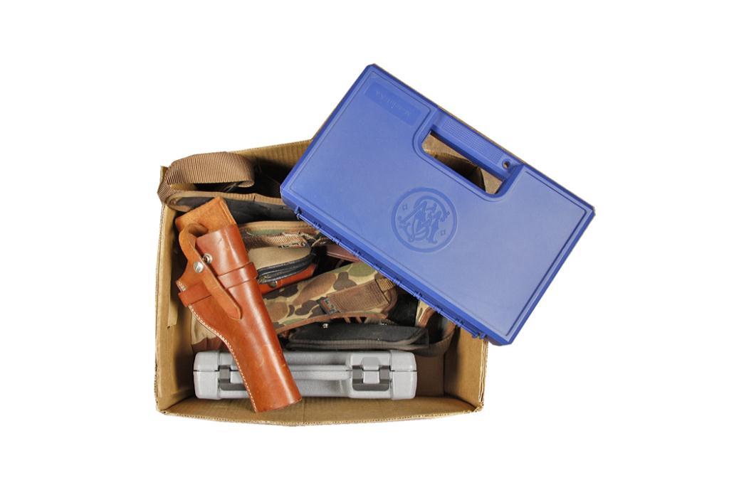 Box Lot of Gun Accessories Consisting of leather ammo belts and holsters, camouflage color holsters, two gun carry cases, and a very nice "Uncle Mikes Side Kick" shoulder rig with large caliber holster and knife sheath.Consisting of leather ammo belts and holsters, camouflage color holsters, two gun carry cases, and a very nice "Uncle Mikes Side Kick" shoulder rig with large caliber holster and knife sheath.
