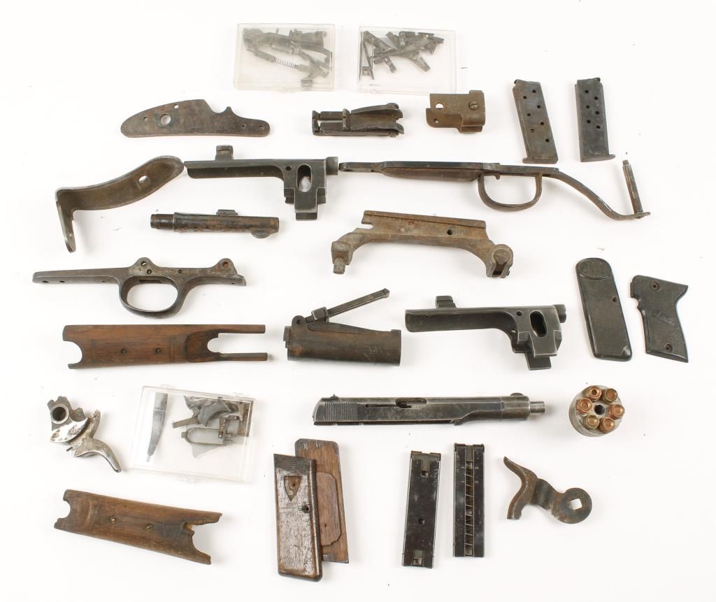 Over 10 pounds. Including magazines, grips, sights, stripper clips, hammers, cylinders, and more.