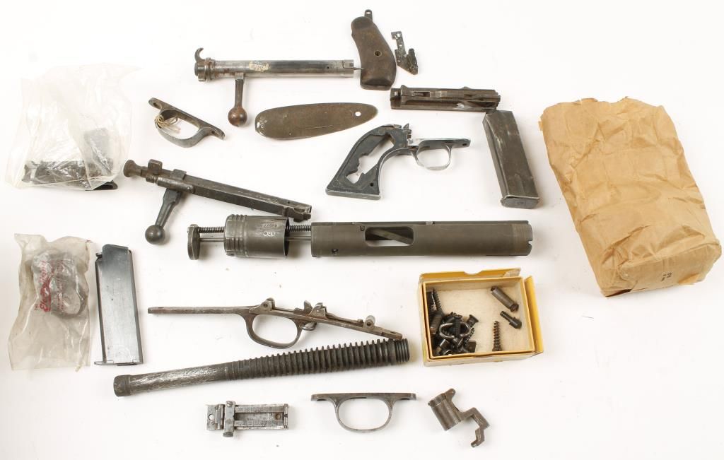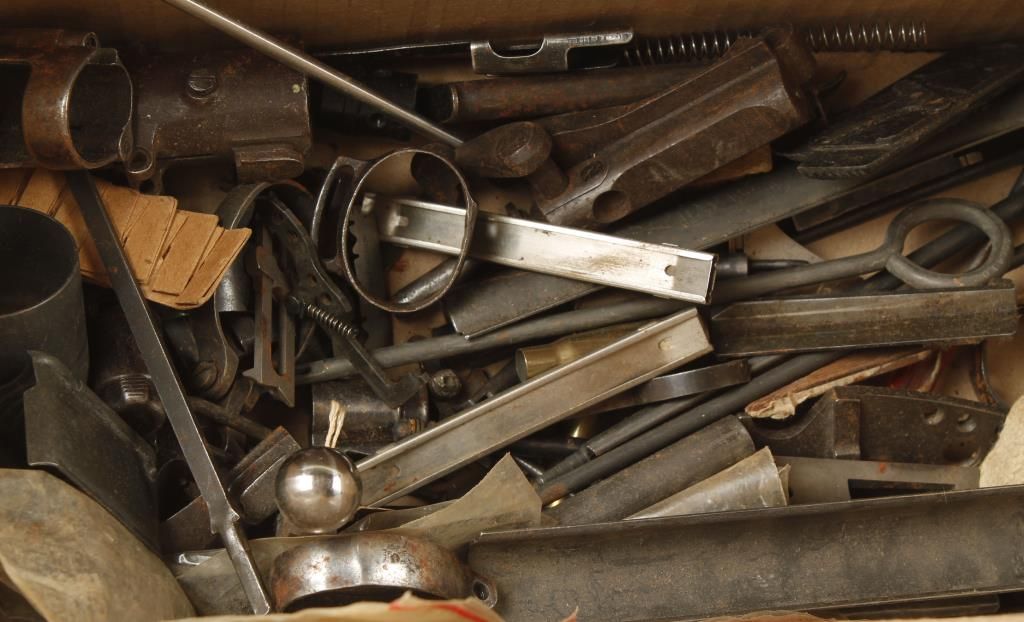 Over 15 pounds. Including barrels, magazines, frames, bolts, slides, and more.