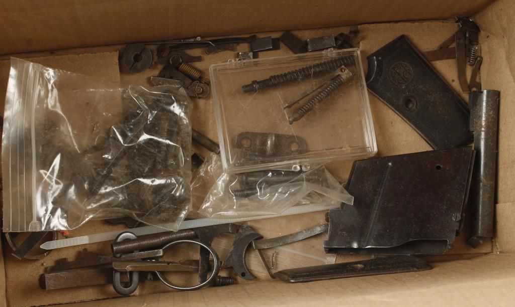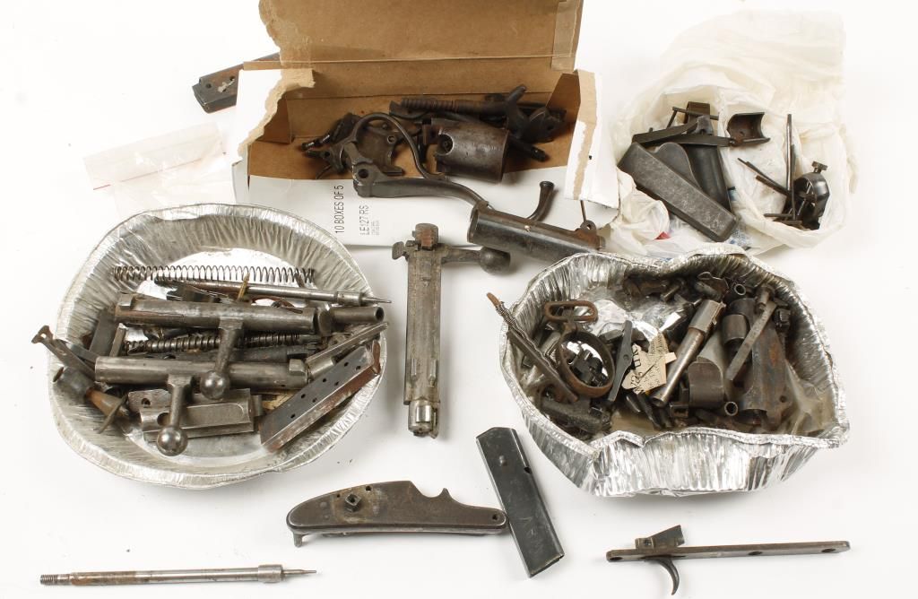 Over 11 pounds including cylinders, bolts, magazines, springs, firing pins, Mauser parts, and more.