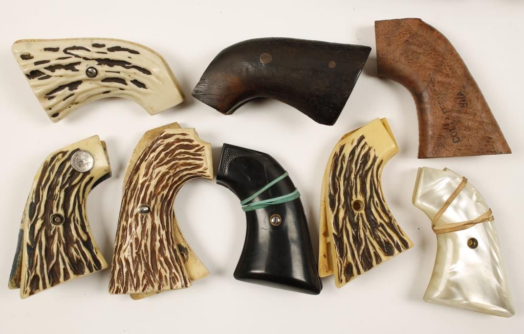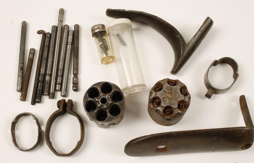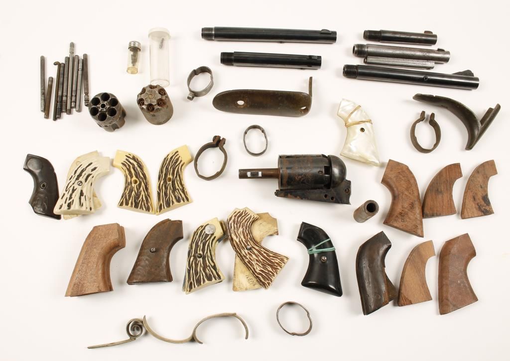 Grips (wood, stag, mother-of-pearl), trigger guard, barrel bands, revolver cylinders, revolver barrels (Colt and Christy), cylinder pins and more.