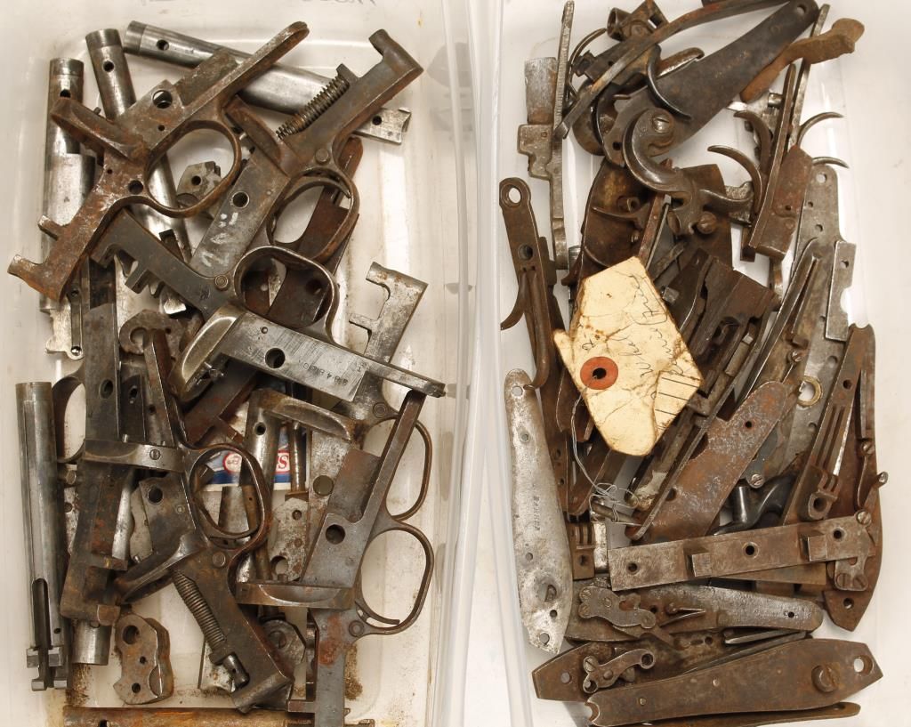 Over 30 pounds including antique single and double barreled shotgun receivers, trigger guards, Remington gun parts and antique shotgun parts.