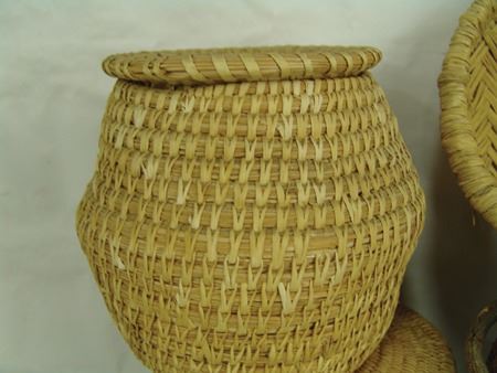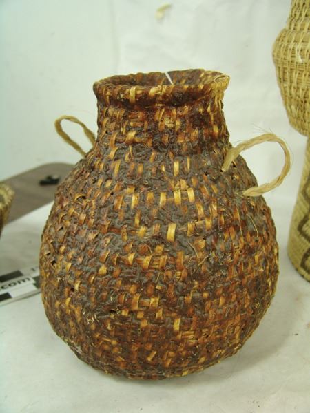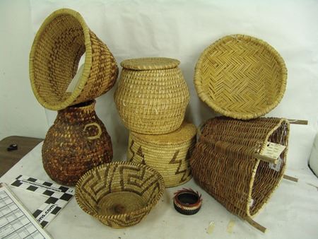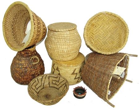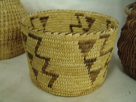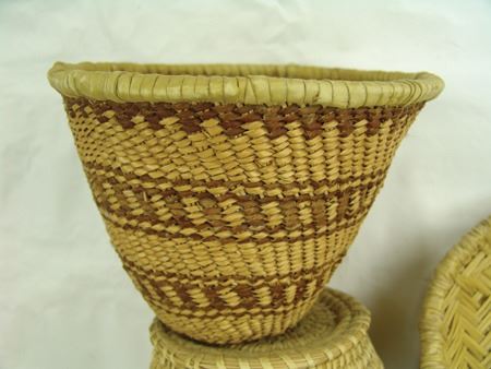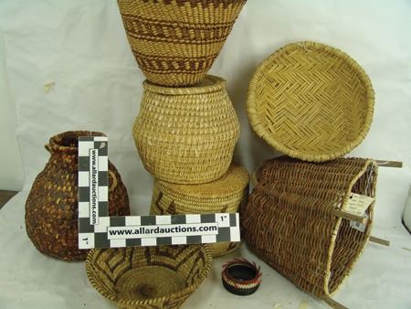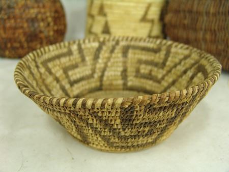 Various Ages, Eight Southwest baskets including a Hopi fruit basket by Darlene Lazo, a Pueblo shifter by Corrina Waquire, an Apache flared bowl and water "tus," a small horsehair bowl, and two regular and one wheat stitch Papago. Good/very good condition. Largest 10" x 8-1/2" x 10-1/2"