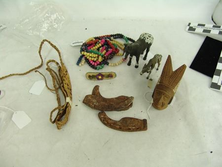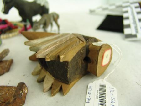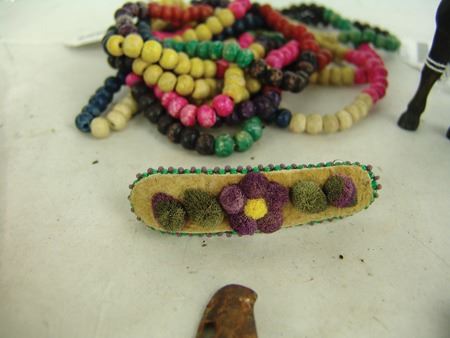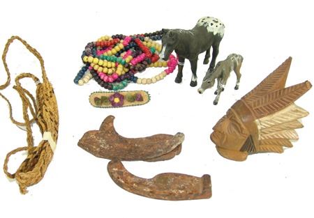 Early/Mid 1900s, Includes a Woodlands carved wooden chief's head pipe, a woven tump line, colorful wooden beads, old horseshoe sections, a Tlingit moose hair barrette, and two toy horses. Good condition. Largest 38"