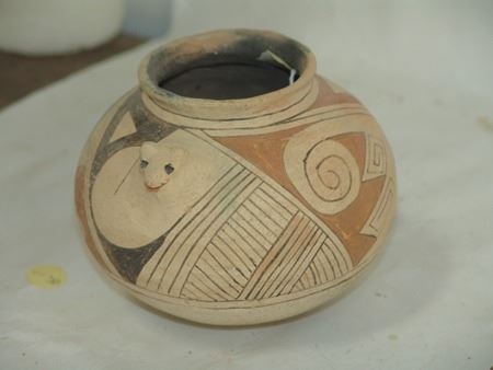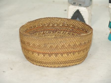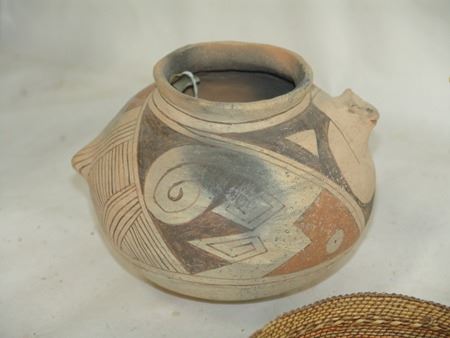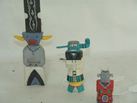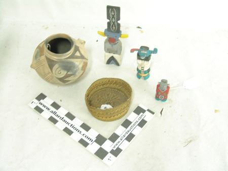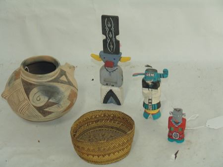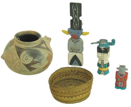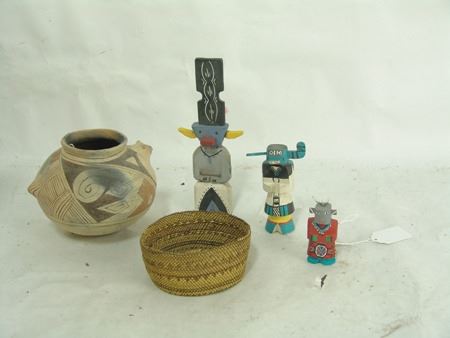 Various Ages, Includes a Casas Grandes polychrome effigy pot, a small 1950s Nootka/Makah basket, and three hand carved and painted Route 66 kachina dolls. All in good or better condition. Largest 5-1/2" x 8"