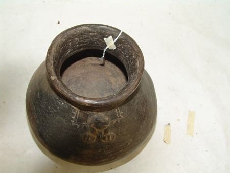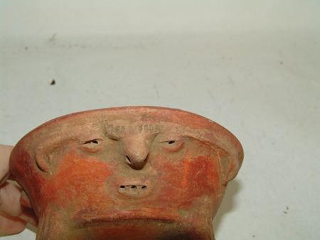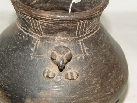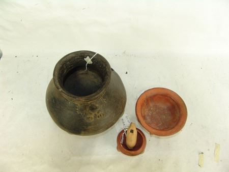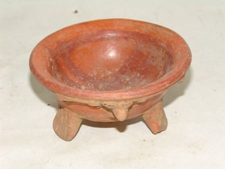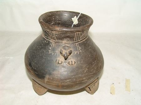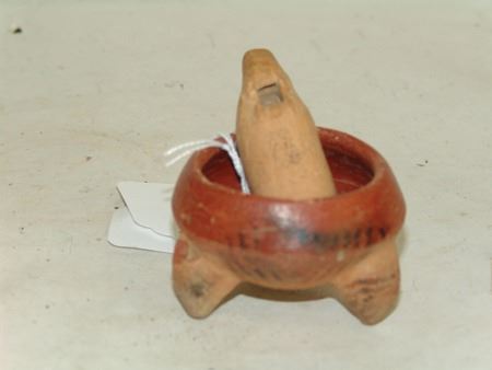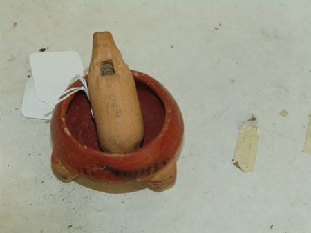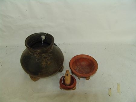 Various Ages, Includes a pre-Columbian pottery black tripod pot with rattle legs, two more smaller red tripod pots, and a small whistle. Largest 7-1/2" x 8"