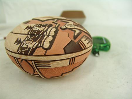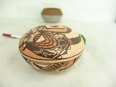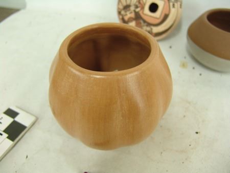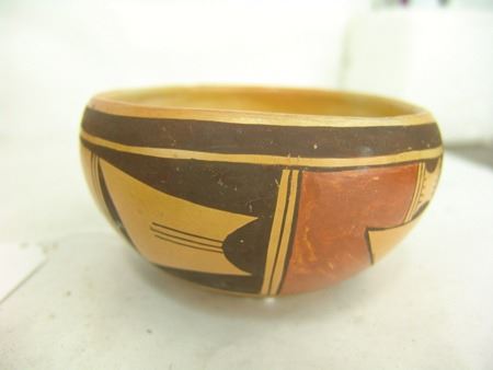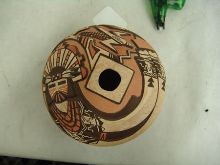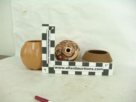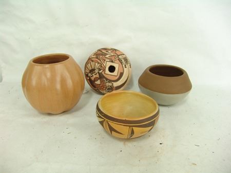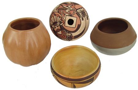 Mid/Late 1900s, Including a vintage Hopi bowl, a carved Hopi seed pot by Delmar Polacca, a San Juan fluted mica jar by Myrtle Cata, and a two tone San Ildefonso bowl by the famous potter Blue Corn. Very good condition. Largest 5-1/2" x 4-3/4"