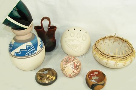 Various Ages, Including a fine Acoma white-on-white bear paw jar by W. Garcia, Ute Mountain pottery pieces, a Navajo wedding vase, and several others. Good to very good condition. Largest 9" x 6-1/2"
