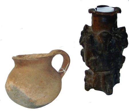 Various Ages, Includes an effigy vase marked "Toltek" and a small handled pot marked "Navajo." (?) Largest 7" x 3-1/2" x 3-1/2"