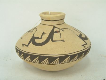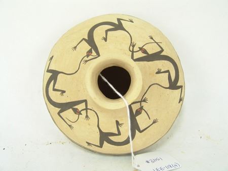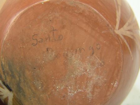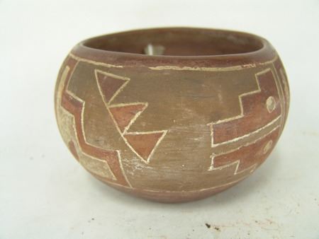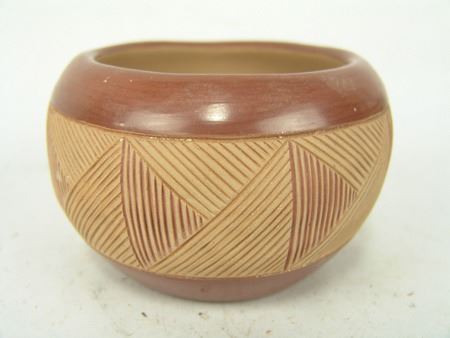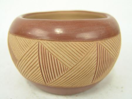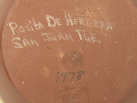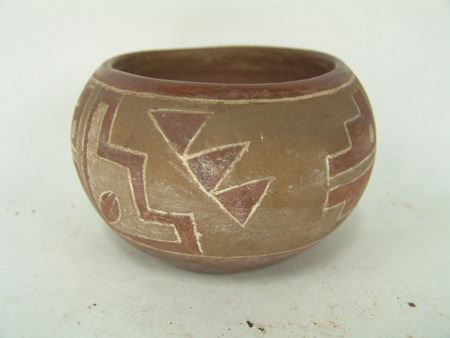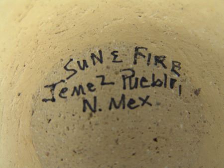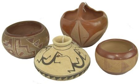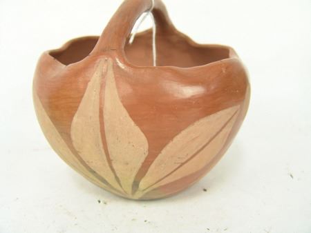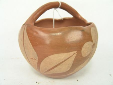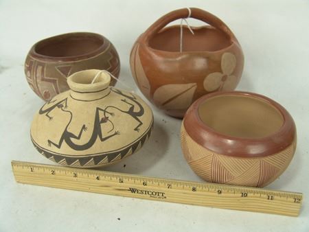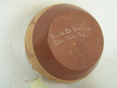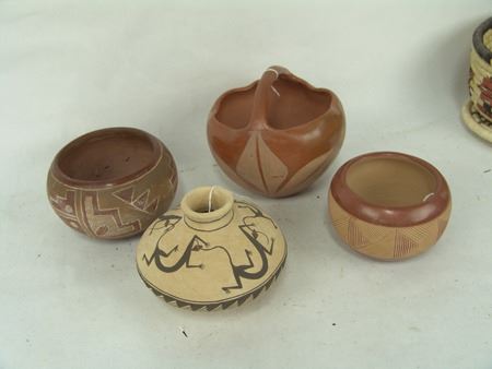 Various Ages, Includes a San Juan incised mica clay pot by Rosita De Herrera, a wide Jemez jar by Sun & Fire (Sal & Flo Yepa), a signed original red pottery basket, and an older San Juan polychrome bowl. Good to very good condition, basket handle re-glued. Basket 6" x 6-1/2"