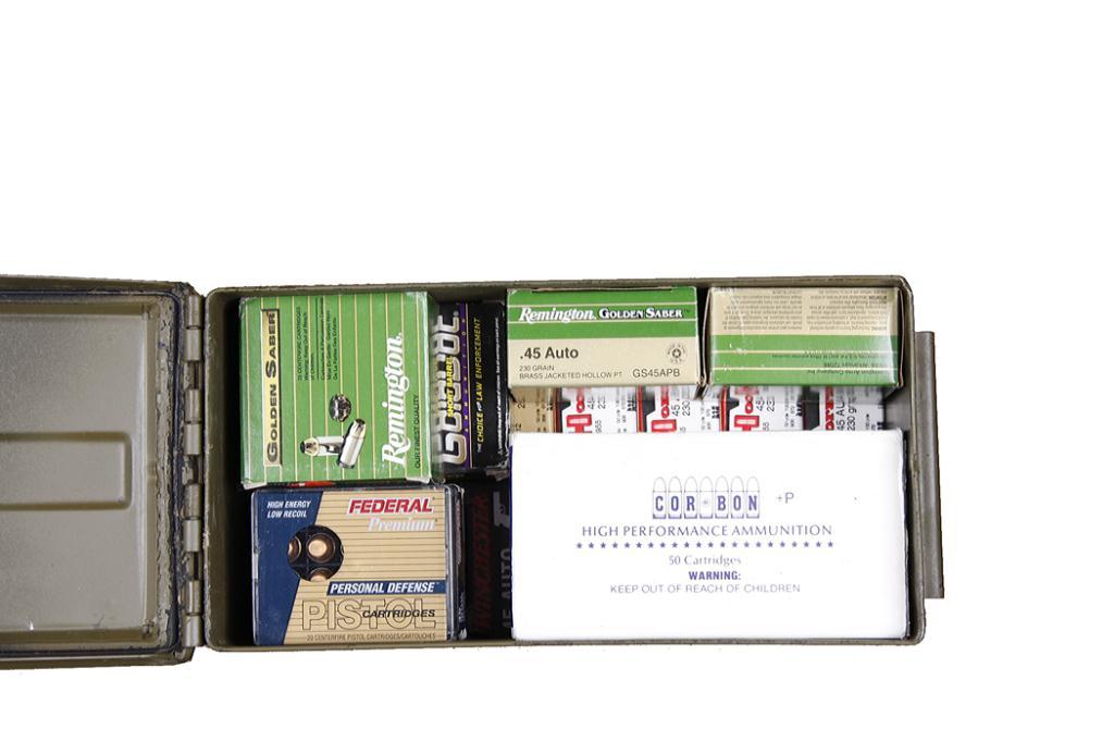 2 part boxes, 57 rdsConsists of: 3 boxes, 20 rds ea Taurus 185gr Hex Copper bullets 3 boxes, 20 rds ea Winchester Supreme 230gr SXT 4 boxes, 20 rds ea Hornady 230 gr +P TAP CQ 3 boxes, 20 rds ea Hornady 200 gr JHP/XTP2 part boxes, 57 rds total, Cor Bon 200 gr +P JHP 1 part box, 7 rds, Cor Bon 185 gr +P JHP 1 part box, 17 rds, Cor Bon 165 gr +P JHP 3 boxes, 54 rds total, Rem Golden Saber 230gr JHP 2 boxes, 20 rds ea Speer Gold Dot 230gr GDHP1 box, 20 rds Federal Premium 165gr EFMJ