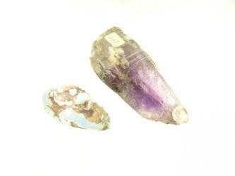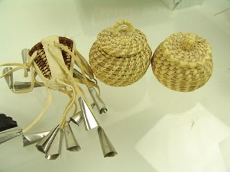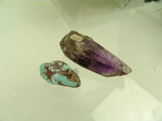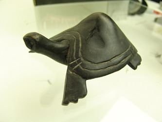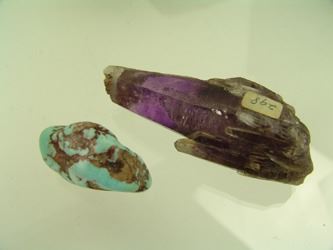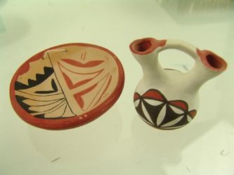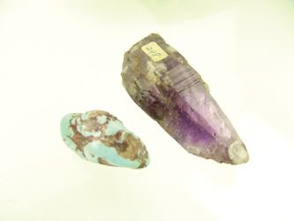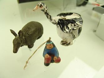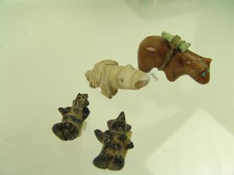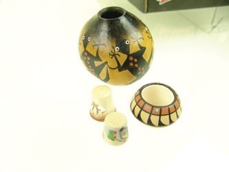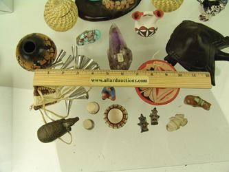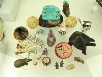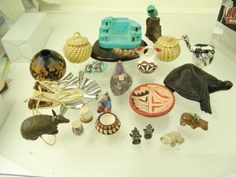 Includes a faux turquoise Pueblo figure, Zuni bear fetish, two Papago wheat stitch baskets, Apache burden basket, sugalite crystal, ironwood turtle, tourist pottery, two thimbles, and other items. All in good/ very good condition. Various ages. Turtle 2" x 5" x 4"