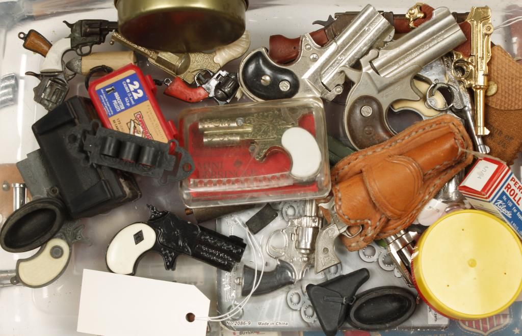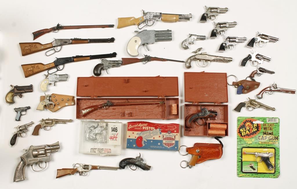 Mostly pistols and many of those are Derringers. Some are cap guns. One Mattel Belt Buckle Derringer in the buckle (and a spare derringer as well). Included is an open box of Roll Caps and 3 partial containers of .22 Cal. pellets.