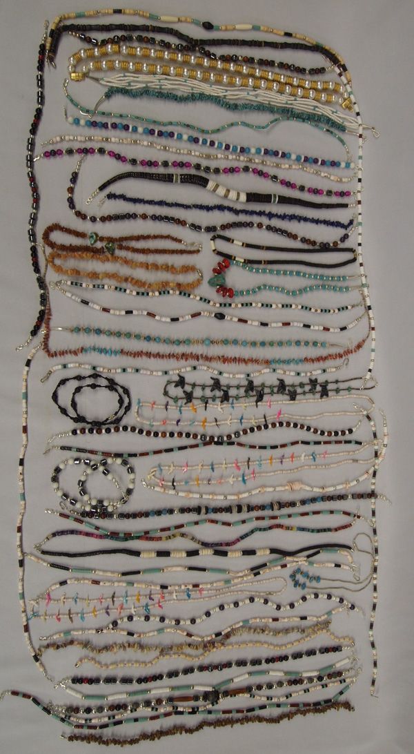 Box Lot of Trade Bead Necklaces. Ther are well over 50 necklaces in this group. They range in length from 12'' to 28'', but most are choker length. There are many tuquoise beads, lots of Heishi, some bird fetishes, coral, jaspar and all manner of other beads. A really nice lot for resale.