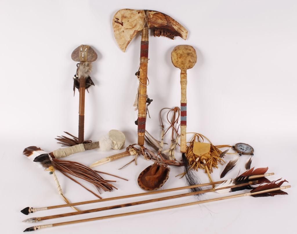 Includes 3 arrows, a jawbone tomahawk, 2 rattles, a stone club, a bone knife, a medicine bag, and more.