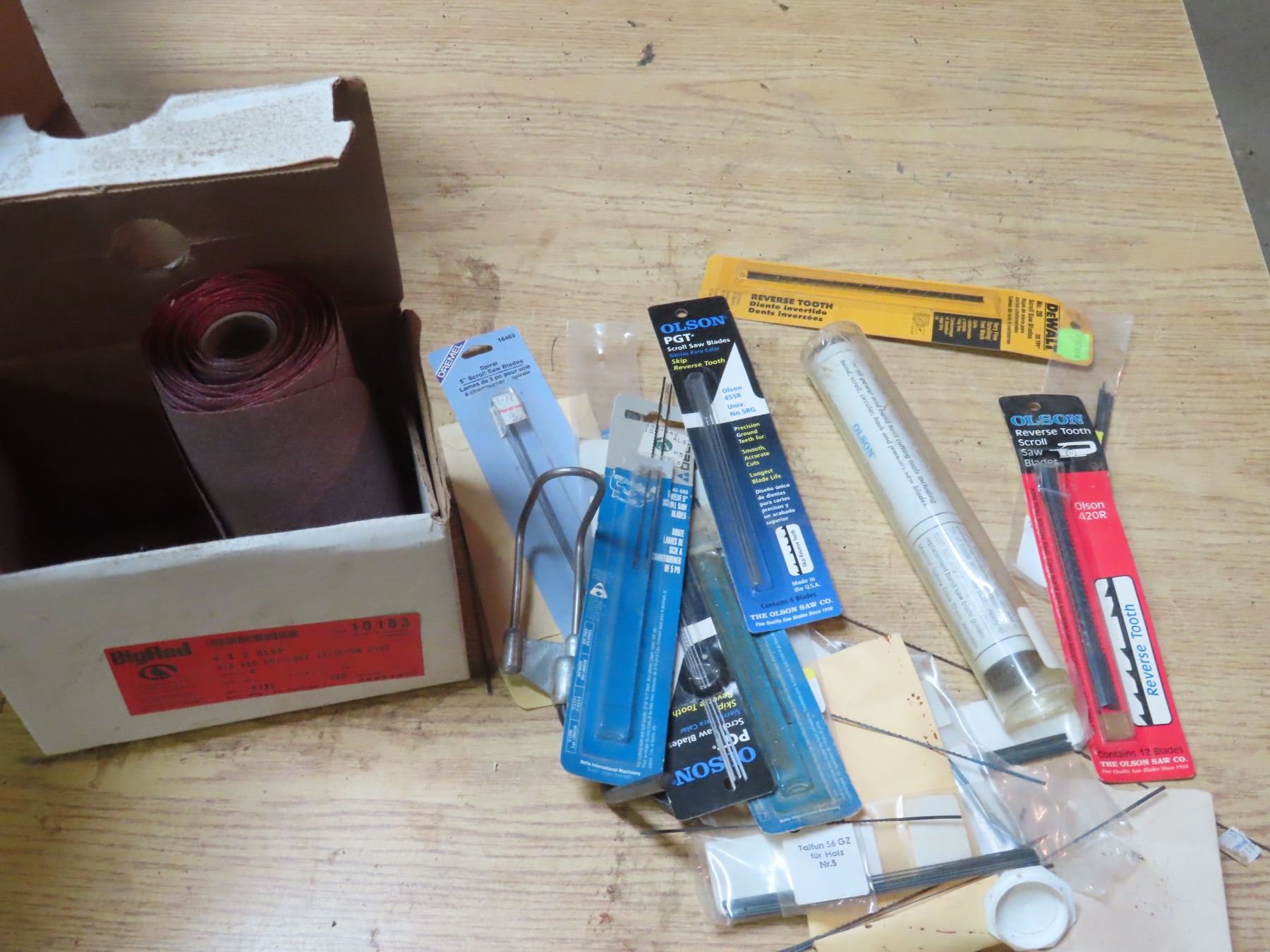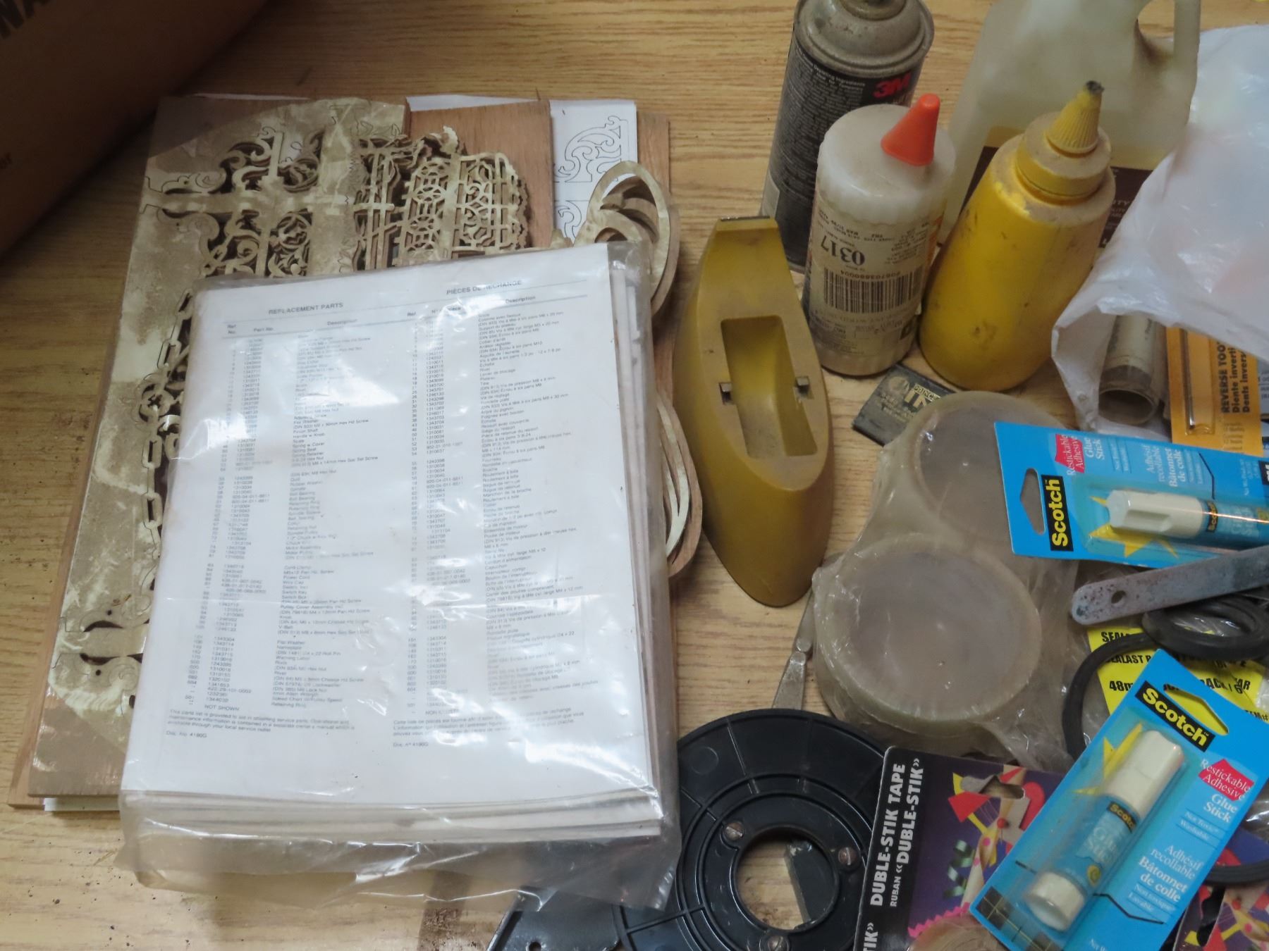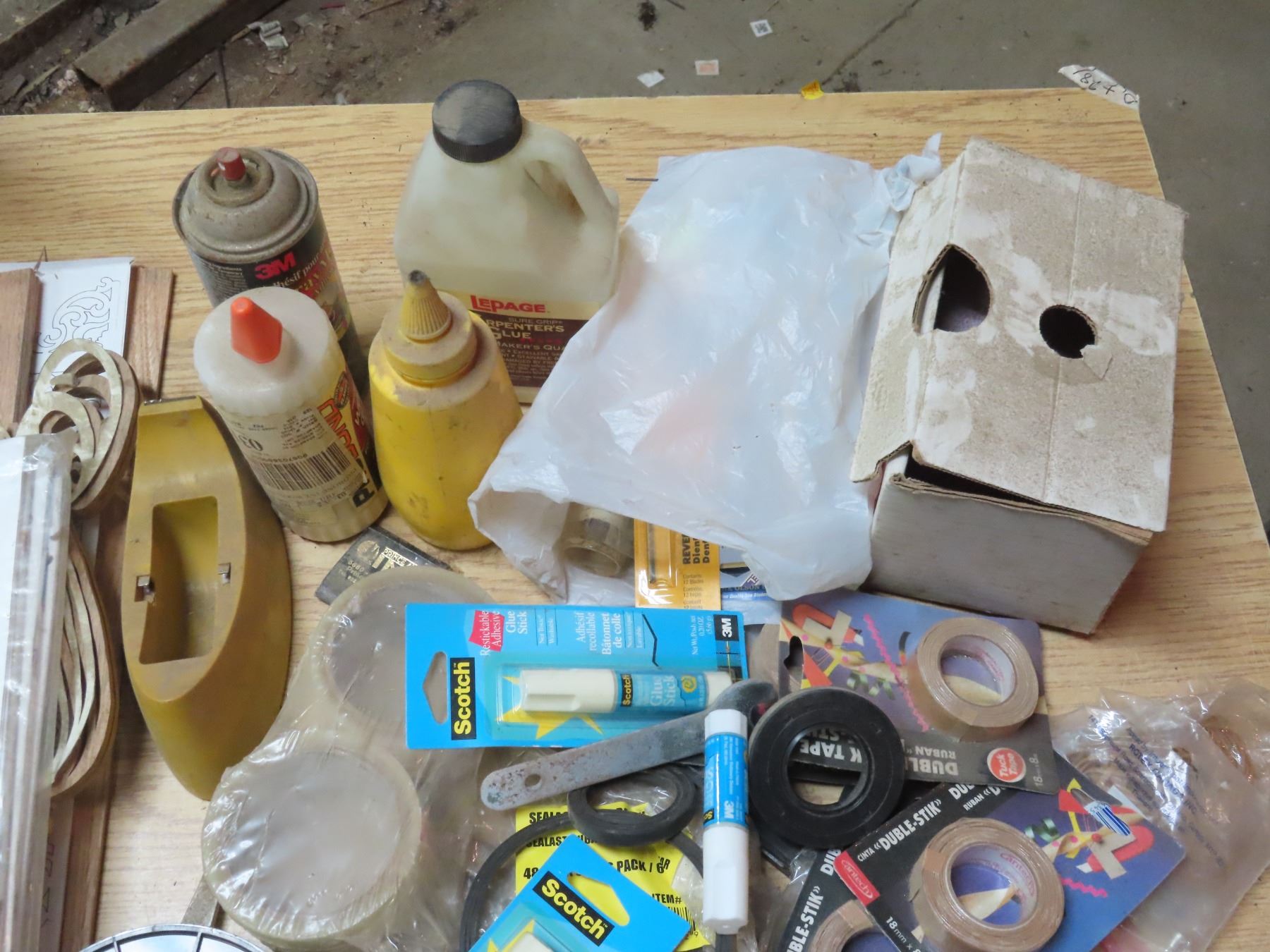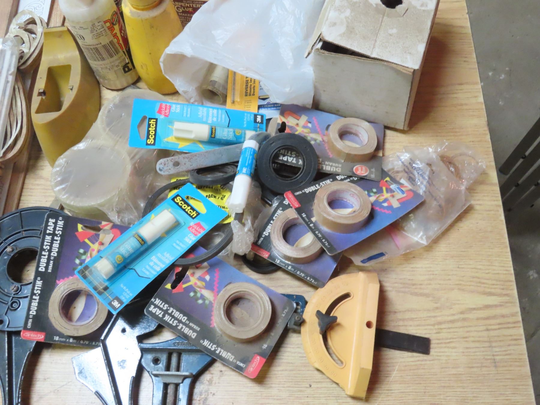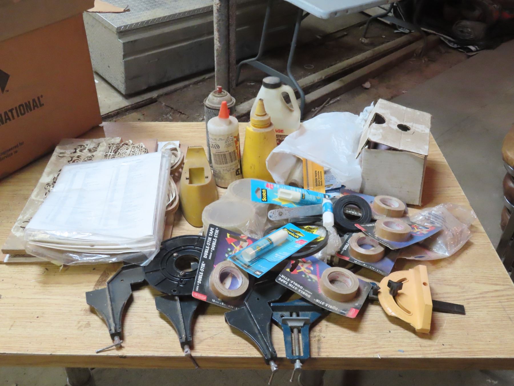 Box Of Assorted Hardware Pieces - Tape, Clamps, Nuts and Bolts, Drill Pieces - Various Hand Tools
