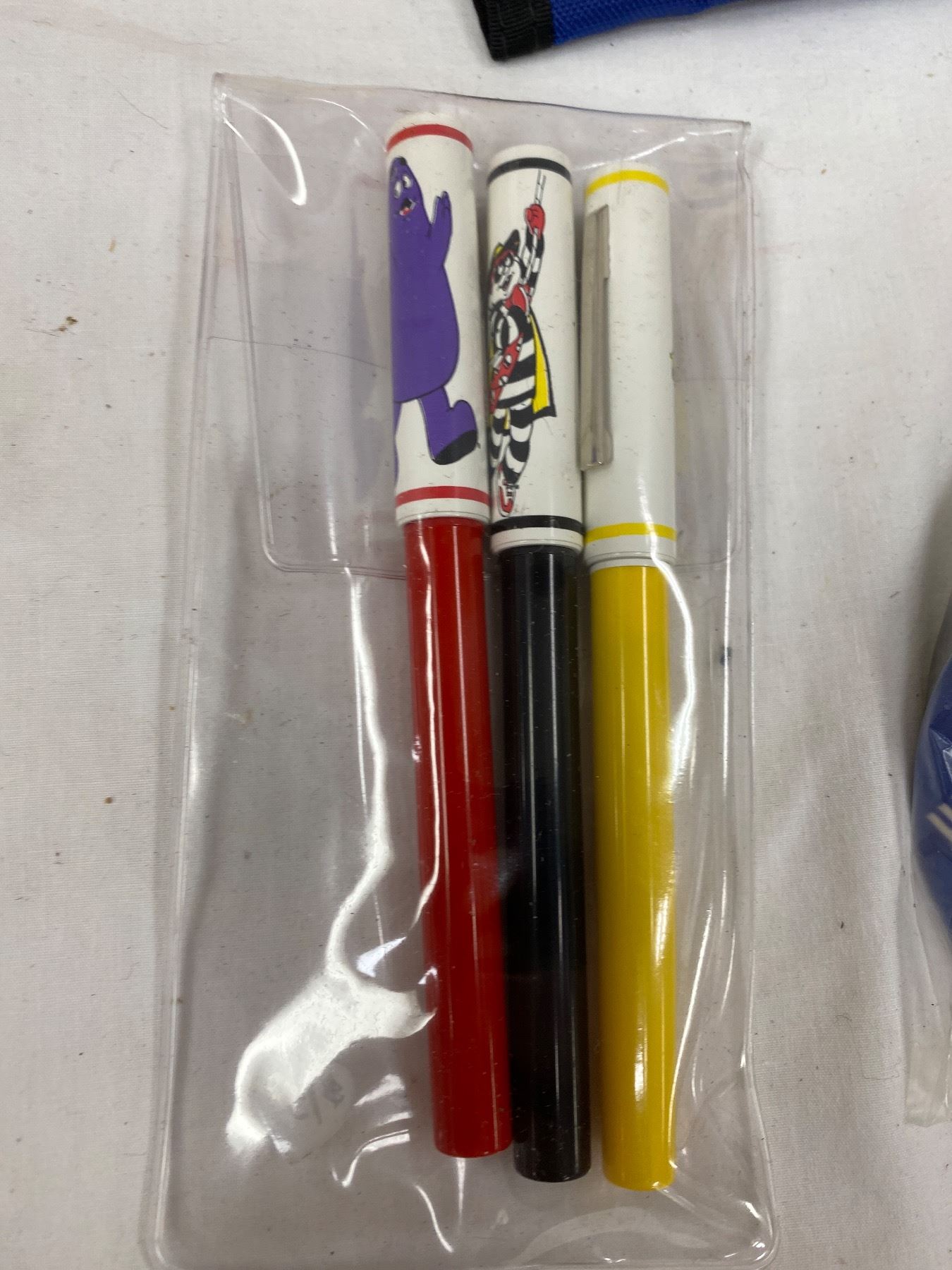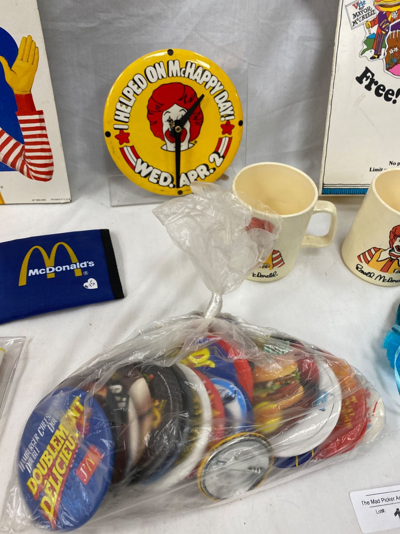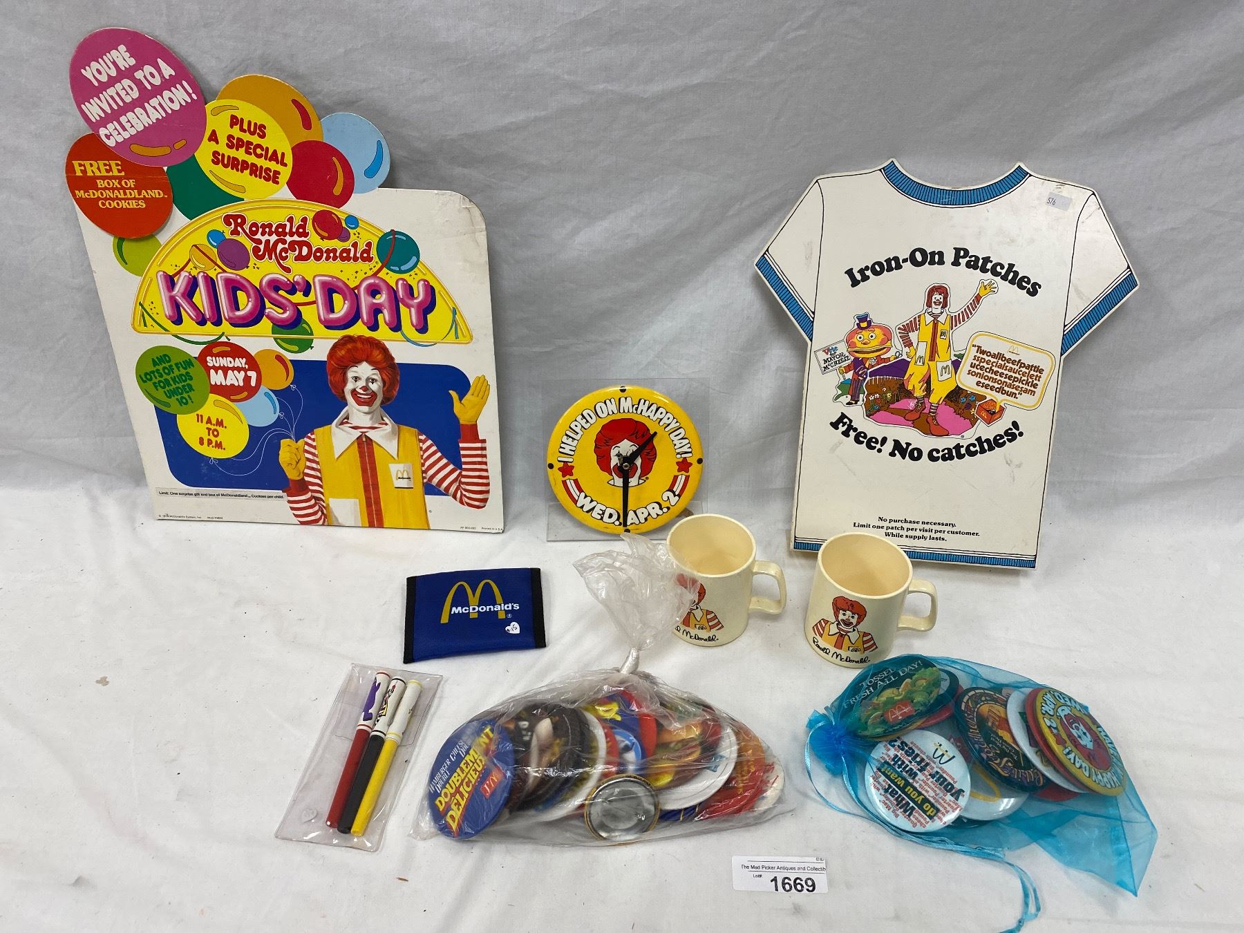 Box Of McDonalds Collectibles, Cardboard Standees, Buttons, Clock, Mugs, Wallet, Etc…