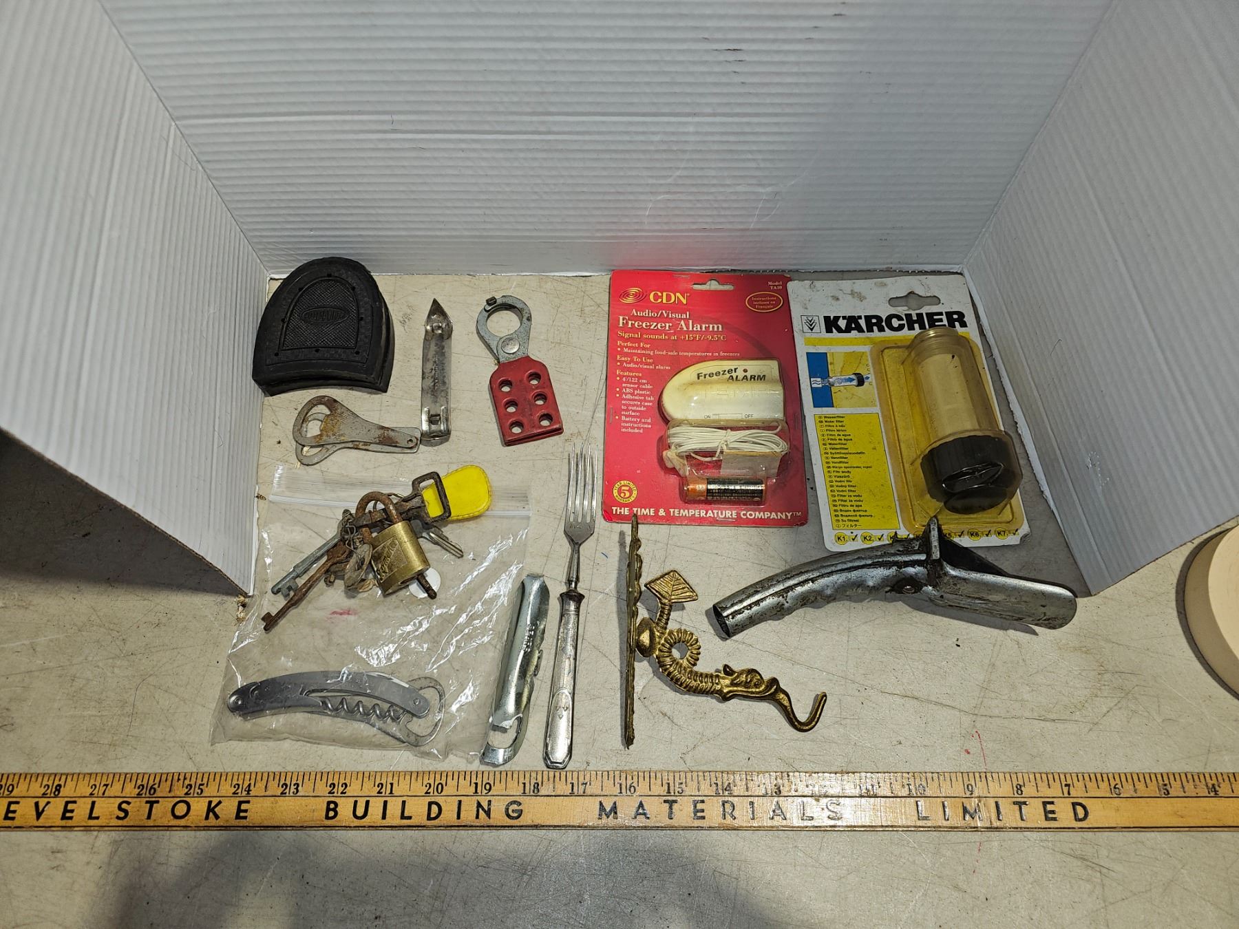 Pair of boot rubber soles, old keys & lock, decorative wall hook, karcher filter, freezer alarm, misc. tools, fork, paint can opener, bottle opener.